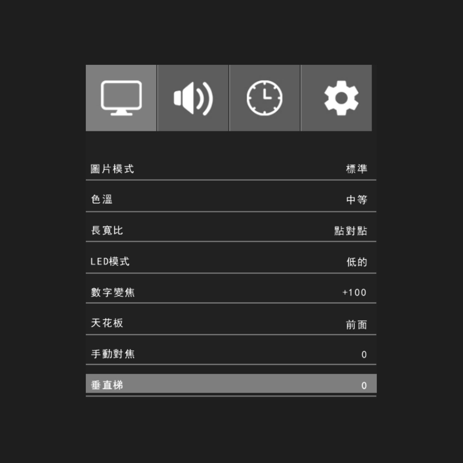 按遙控器的菜單按鈕進入圖像菜單 ,按向下按鈕移動到垂直梯形校正菜單 ,按確認鍵 進入下一級菜單 ,按向左或向右鍵將梯形校正值調整到適當的大小。