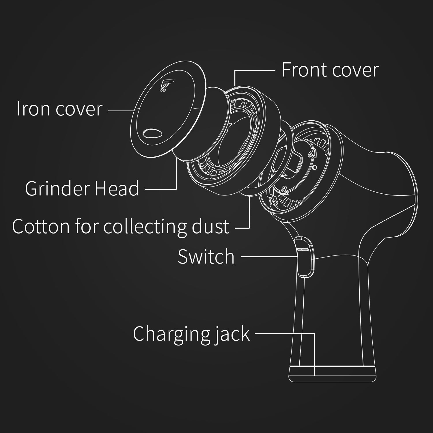 - After finishing using it, take off the grinder head, use the water to clean the brush and make it dry. As for the machine body, just take off the cover and pat it. As for the cotton for collecting dust, you could change it which depends on your usage.