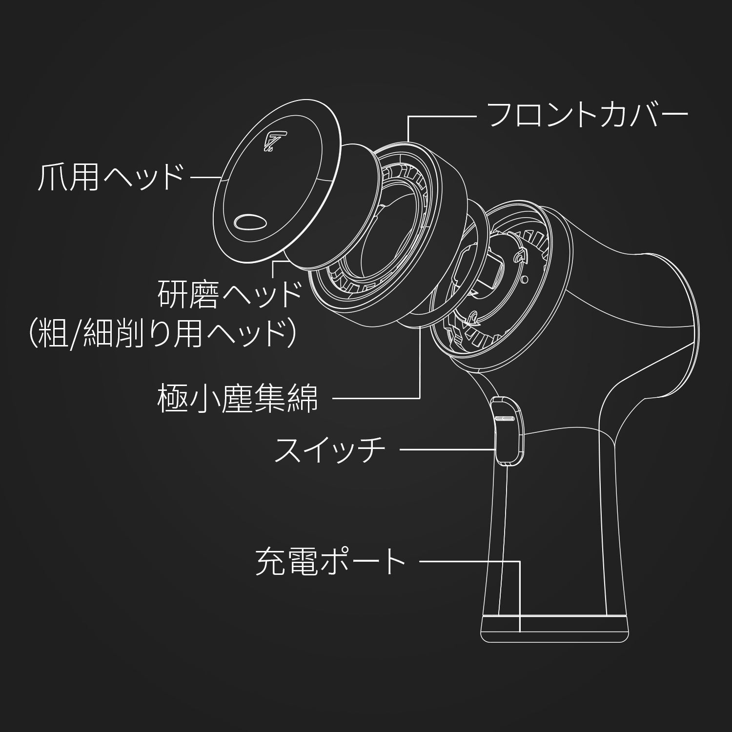 - 爪を研磨する際は、爪用ヘッドを本体に吸着させることで、爪を効果的に保護できます。