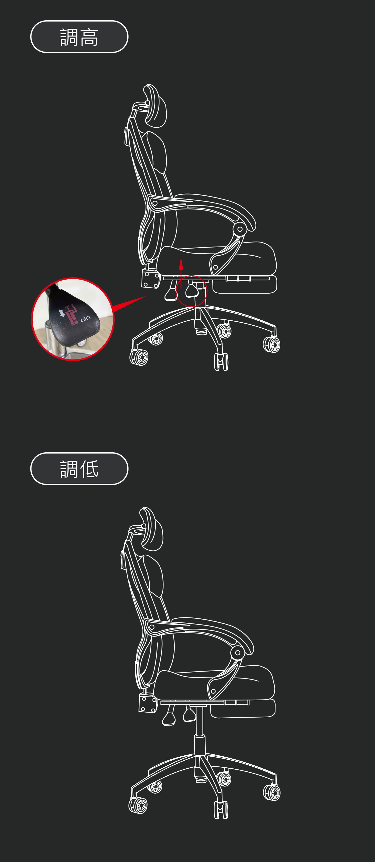 1.調高 : 上拉調整桿時將身體微微抬高,椅墊會隨之上升