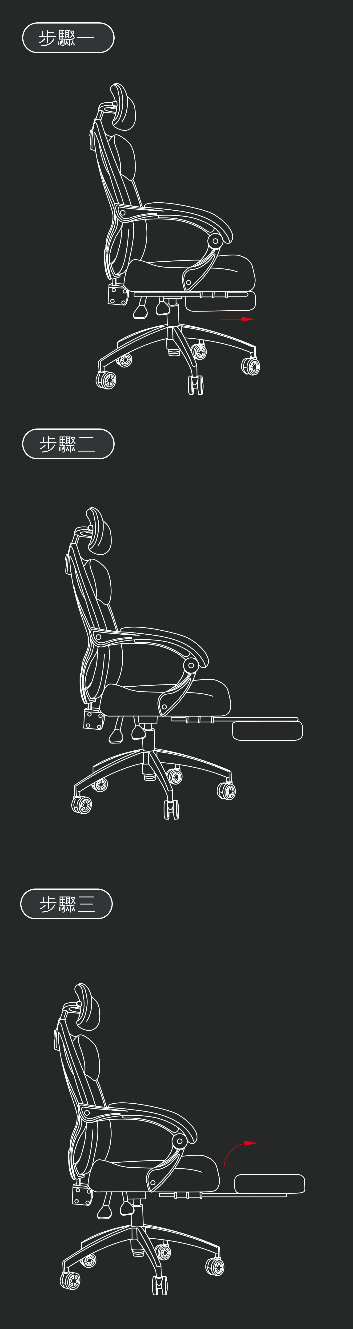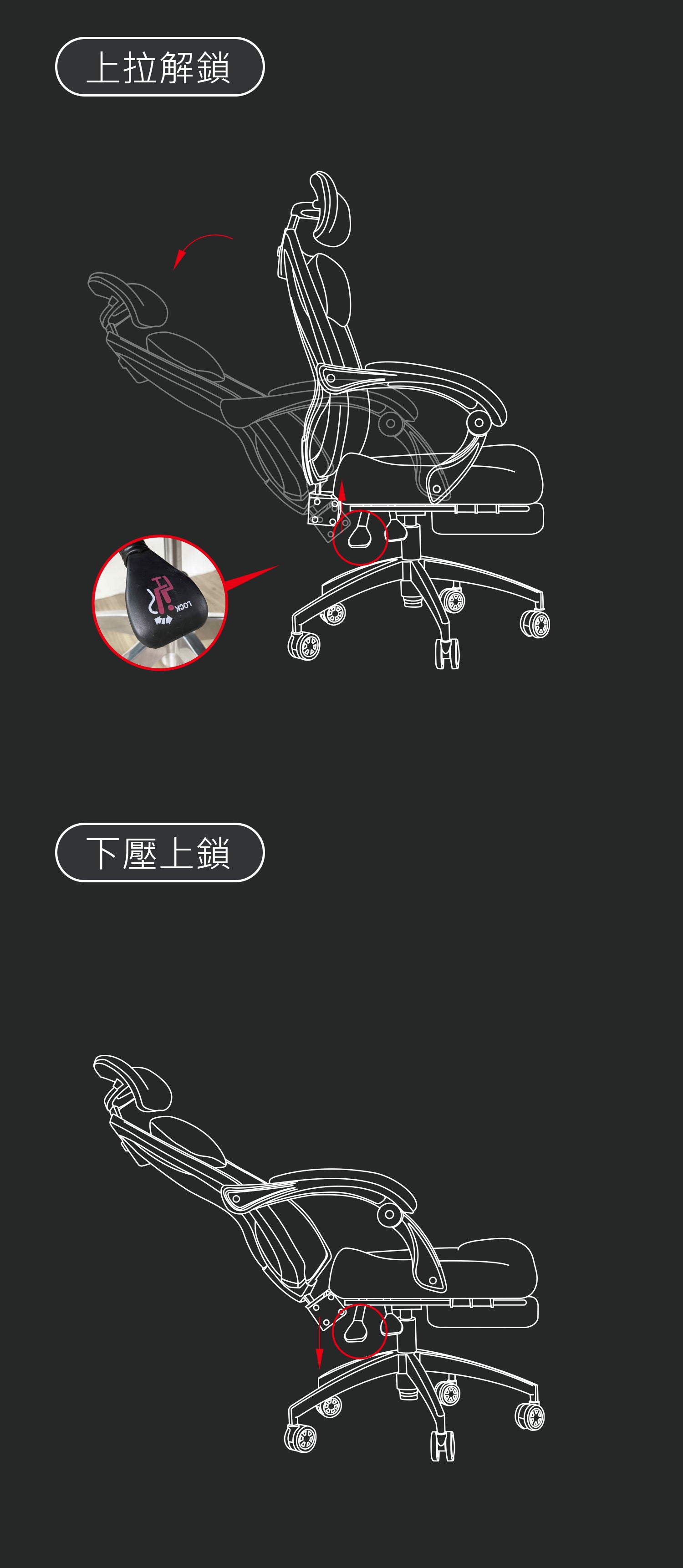 1.上拉解鎖 : 將身體往前或往後傾,即可任意調整椅背角度