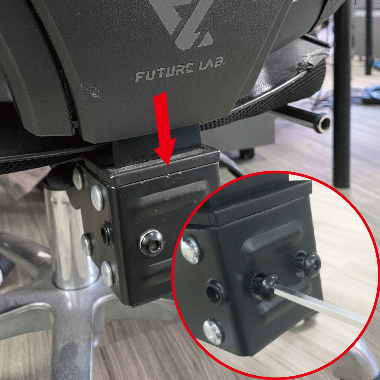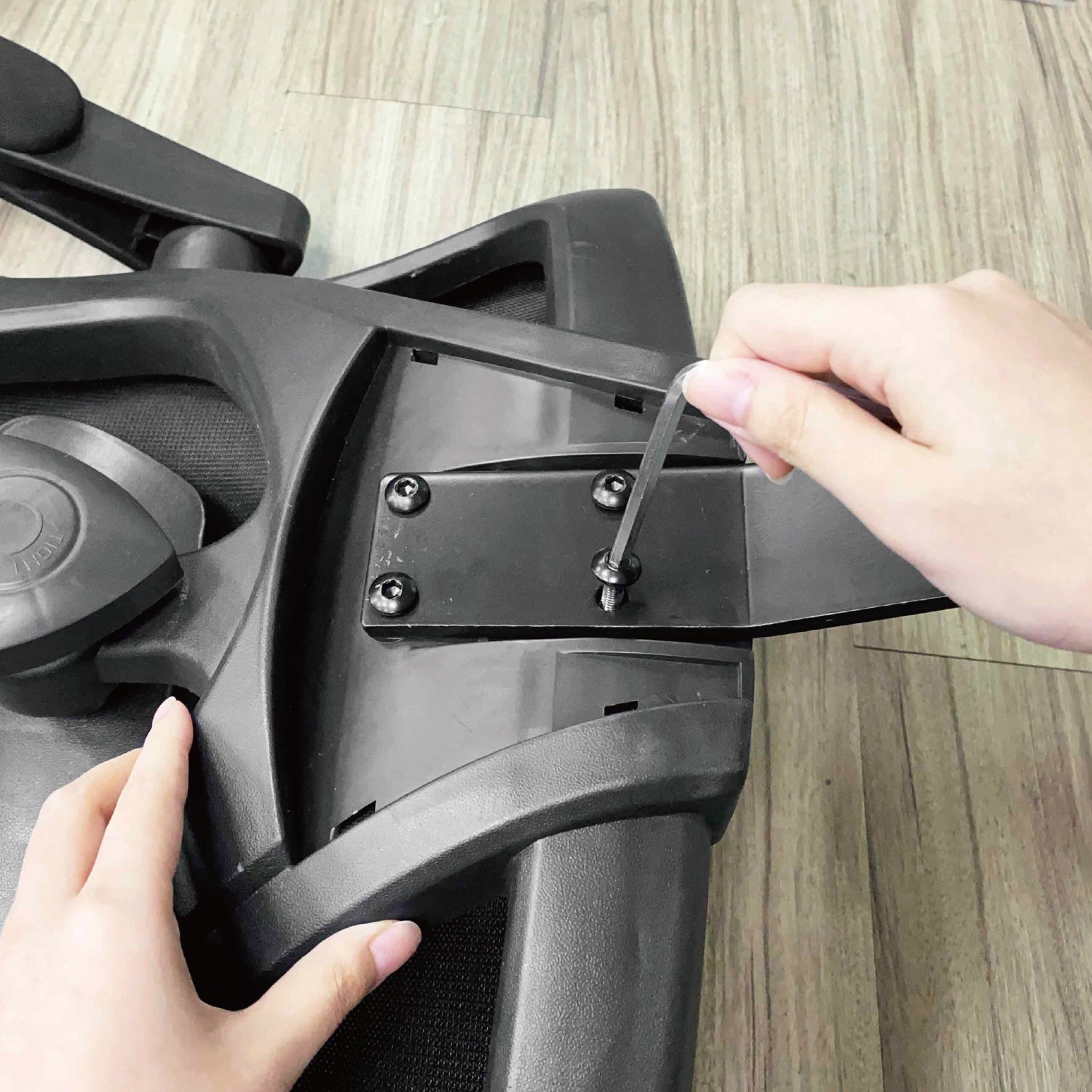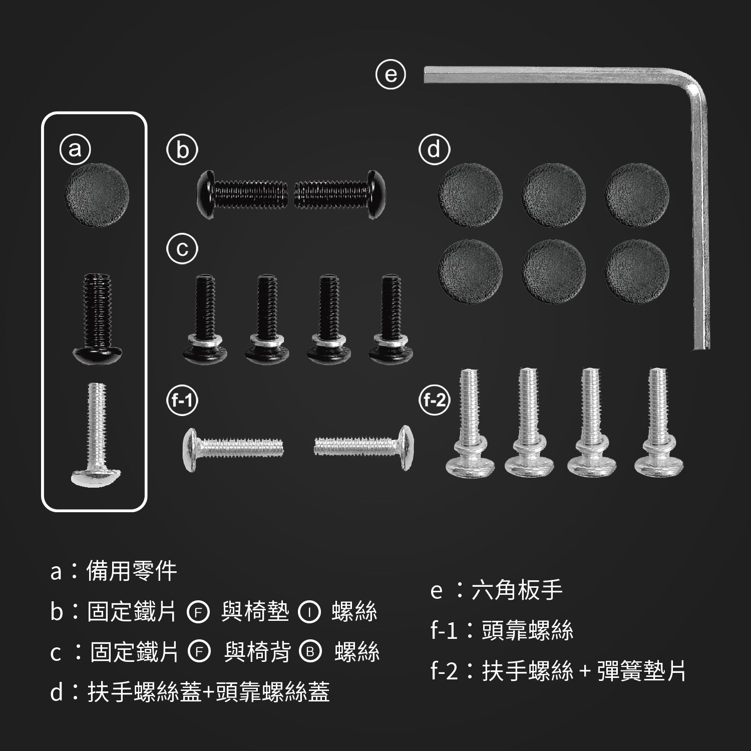 4.鐵片 Ⓕ 翹面朝上,使用椅背螺絲 c 將鐵片固定於椅背 Ⓑ。