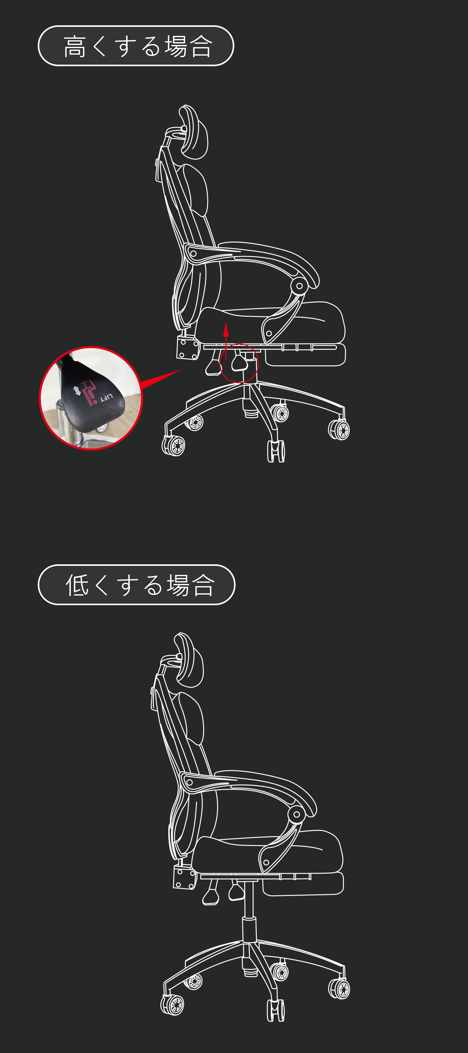 2. 低くする場合:調整レバーを上に引き上げ、体重を利用してシートを下降させます。