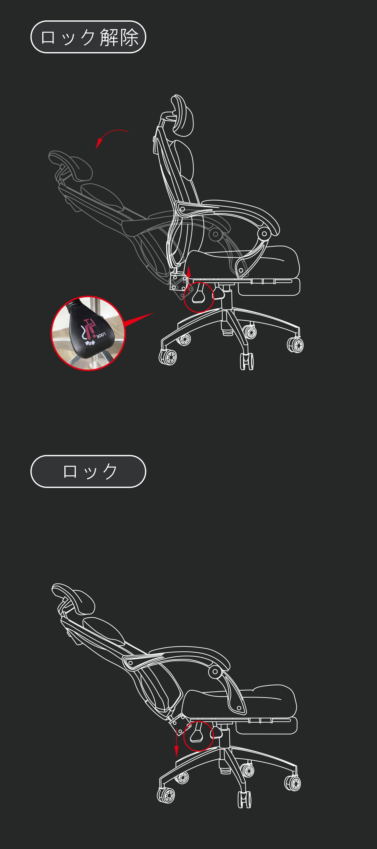 1. ロック解除:調整レバーを引き上げて、身体を前後に傾けると、リクライニング角度を自由に調整できます。
