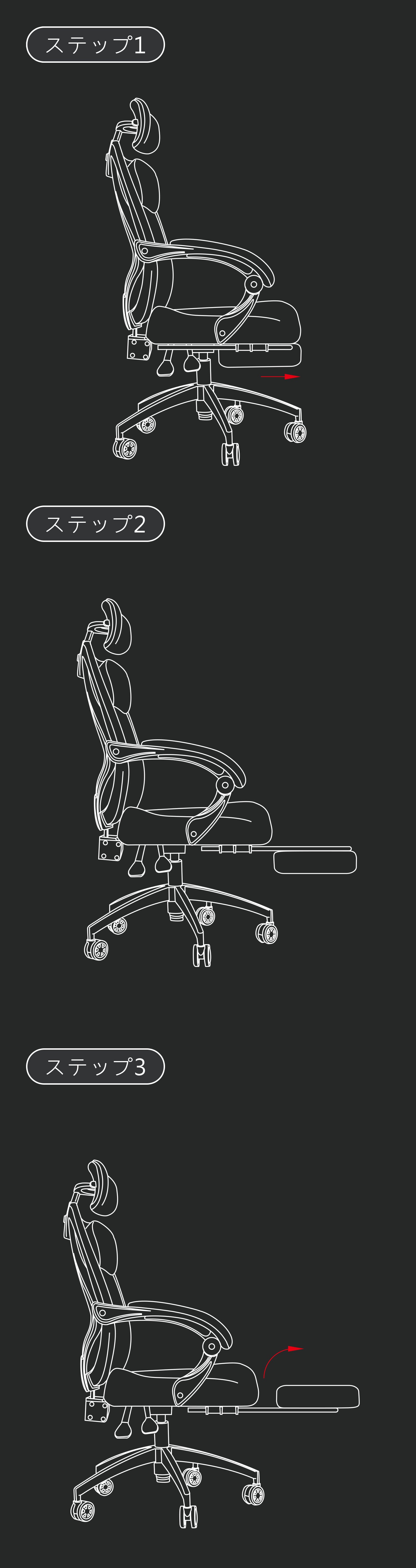 2. フットレストを引き出すと、「カチッ」という音がします。これは位置が確定したことを示します。