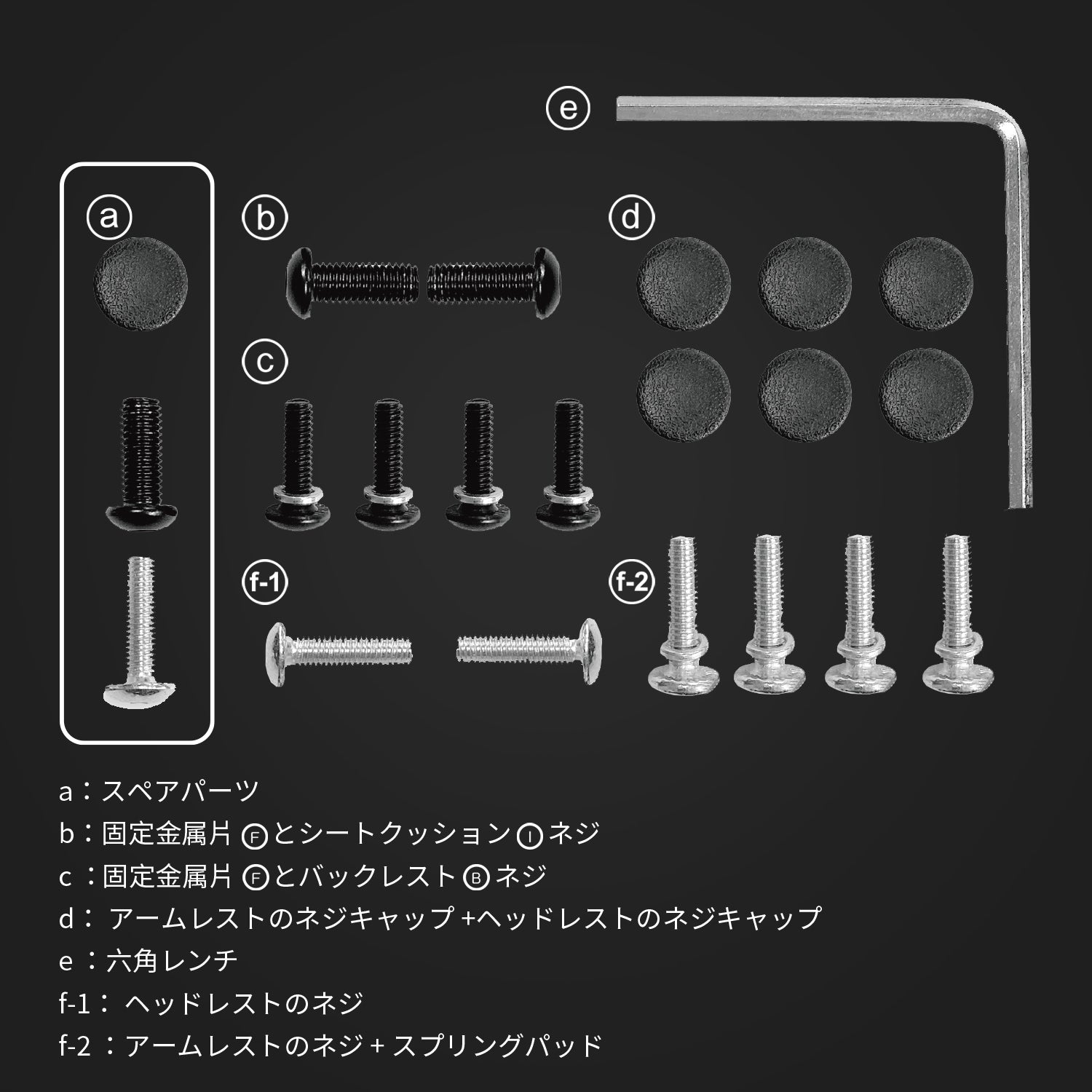 7.アームレスト Ⓒ を固定するためにアームレストネジ + スプリングパッド f-2 を使用し、その後アームレストネジキャップ d を取り付けます。