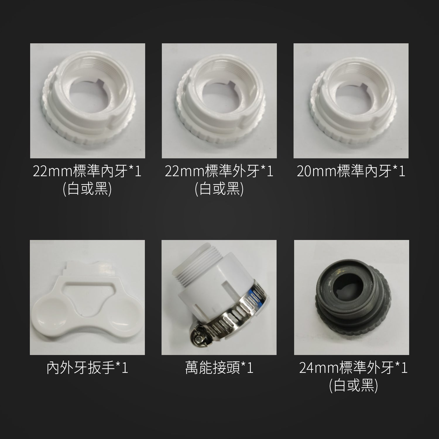 1. 依照水龍頭尺寸選擇內牙,並將黑色平墊片套進去。