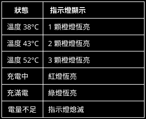 •短按 切換溫度(循環模式):38°C → 43°C → 52°C → 38°C