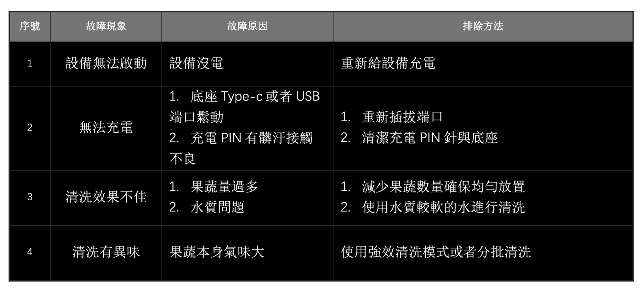 - 清洗完成後,設備自動停止工作,取出清洗後的食材,排乾水槽或清洗盆中的水取出設備晾乾 或者甩乾設備中殘留水漬。