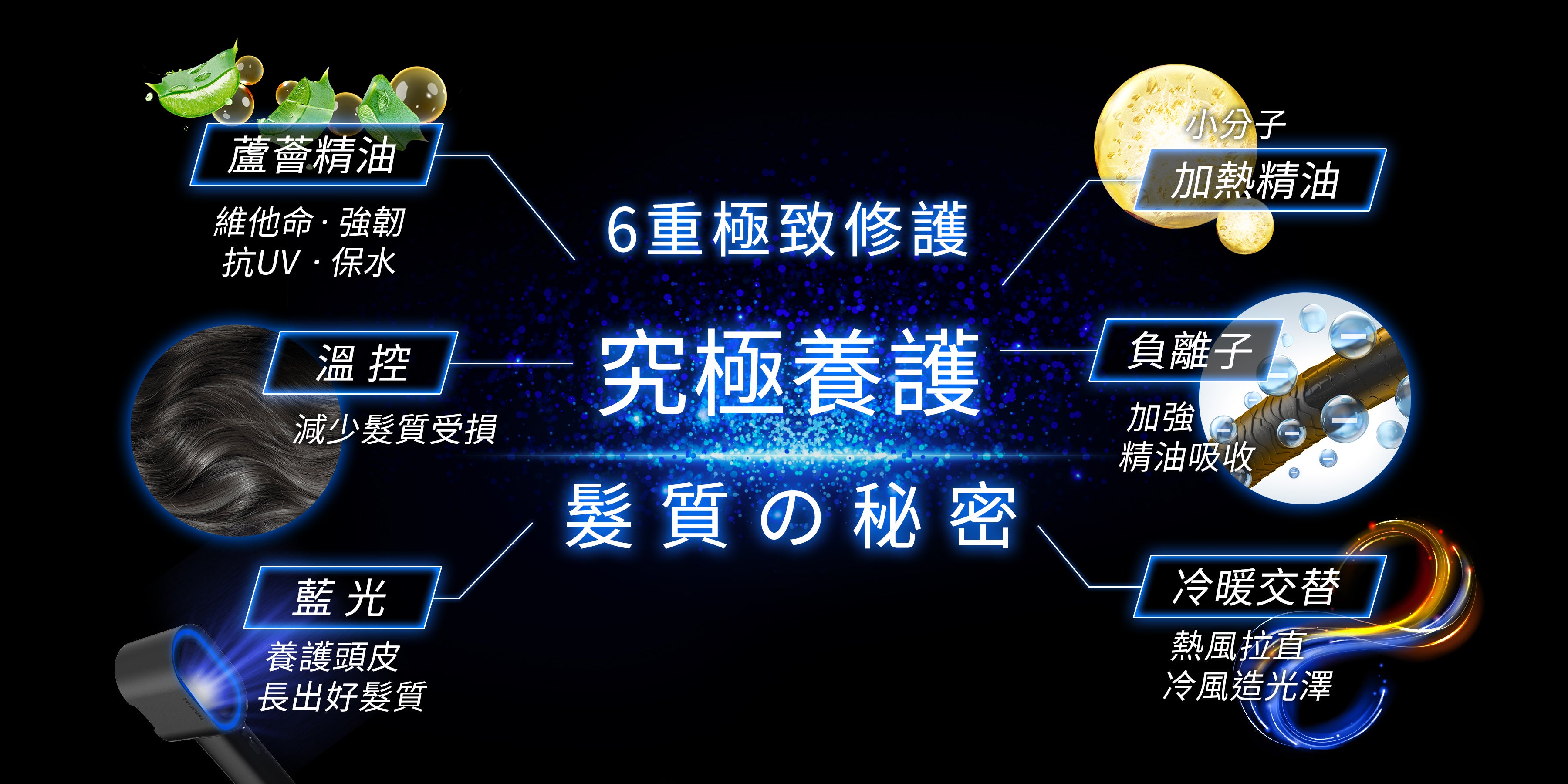 吹風機內建蘆薈保濕護髮精油,加熱釋放滿滿小分子維他命A、C、E,給足髮絲養分並將毛鱗片鎖閉,助於髮絲韌性,修護受損髮質,讓手感更加柔順。