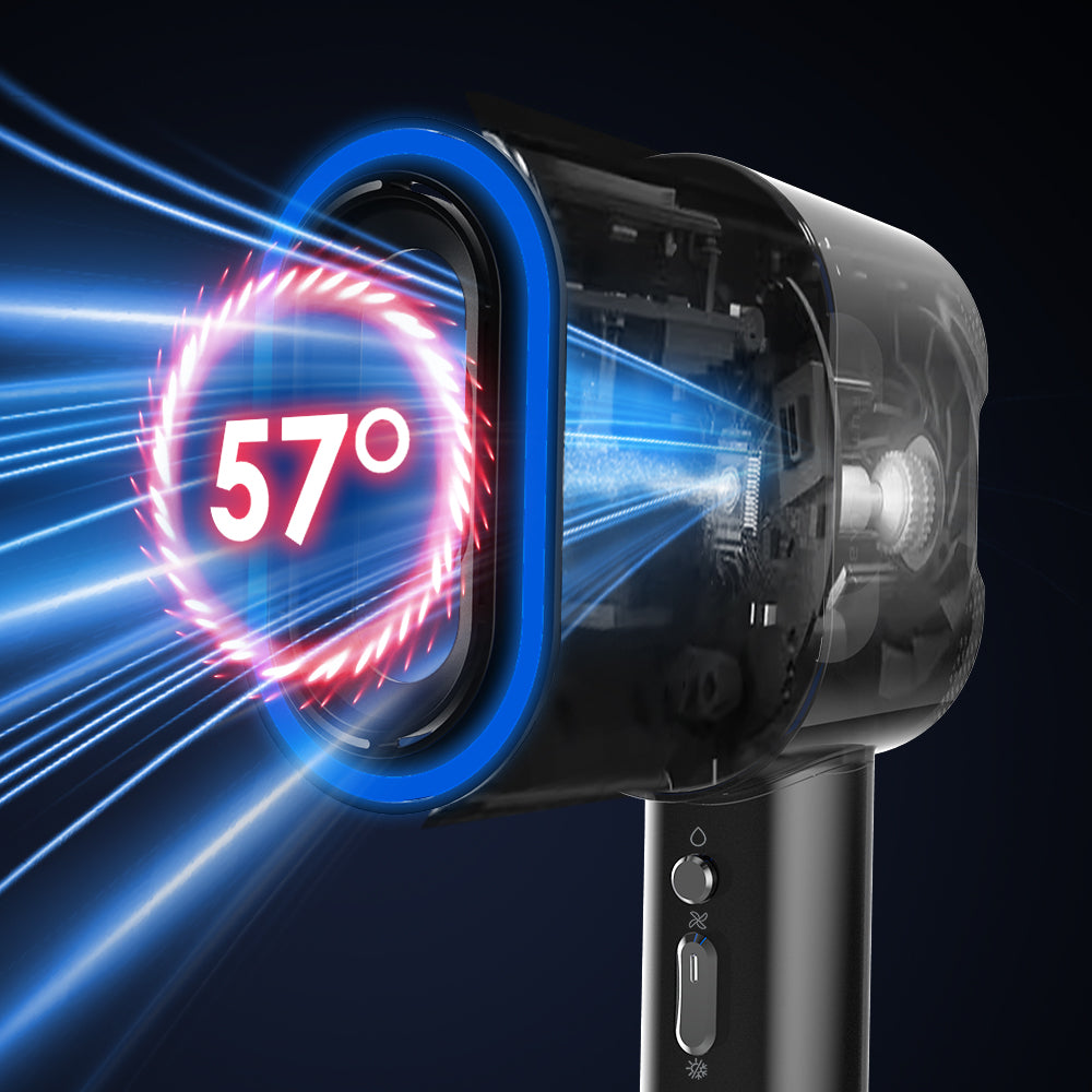 三段溫控模式,一鍵進入護髮57度,溫柔對待毛鱗片,友善頭皮皮脂膜。
