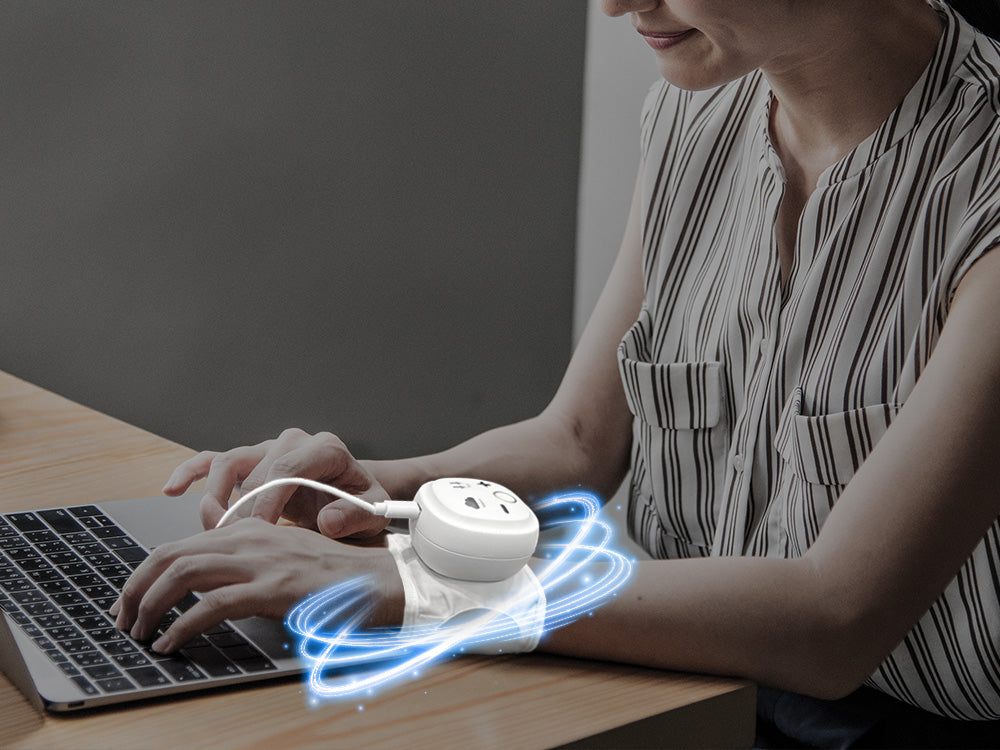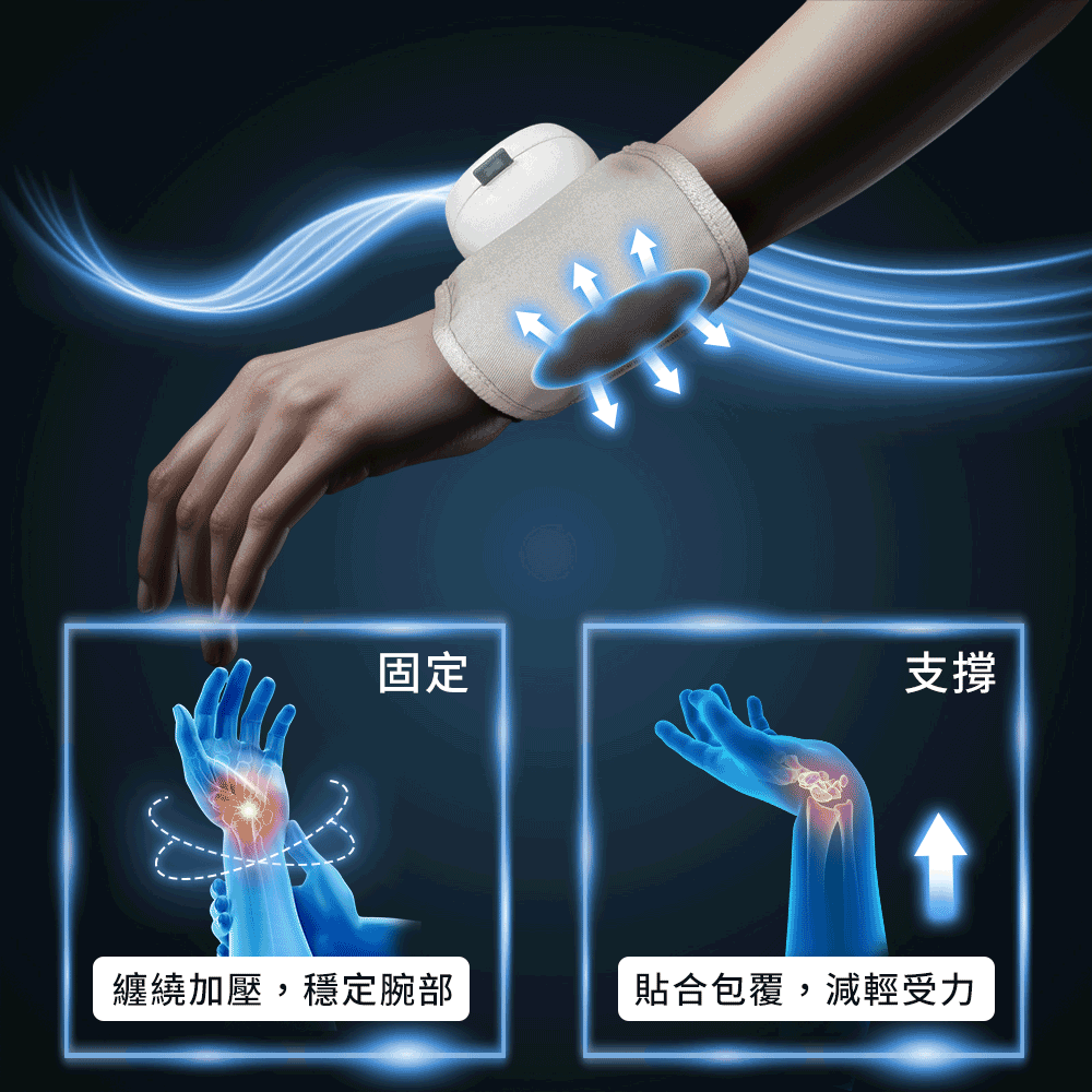 支撐、舒緩、微電流,創造三合一高價值!360°全方位包覆手腕,繃帶般纏繞設計,魔鬼氈自由調節鬆緊度,完美貼合手部曲線,左右手通用,無線設計在任何場合都能輕鬆使用,一台即可舒緩所有手腕痠痛不適等問題