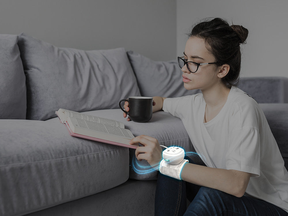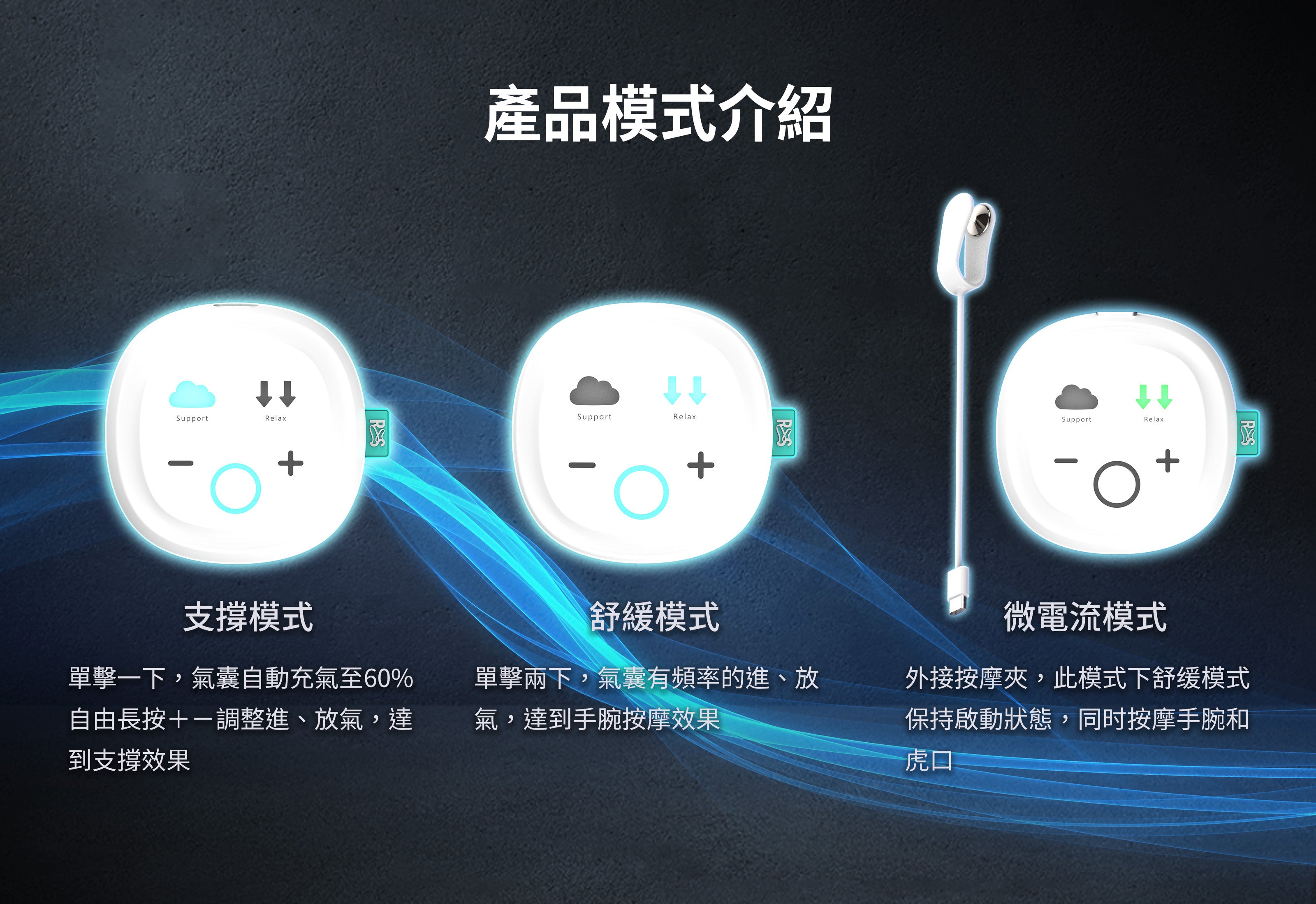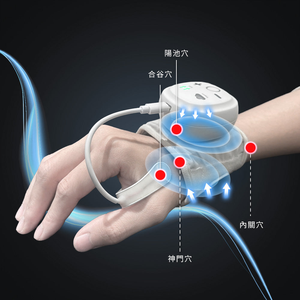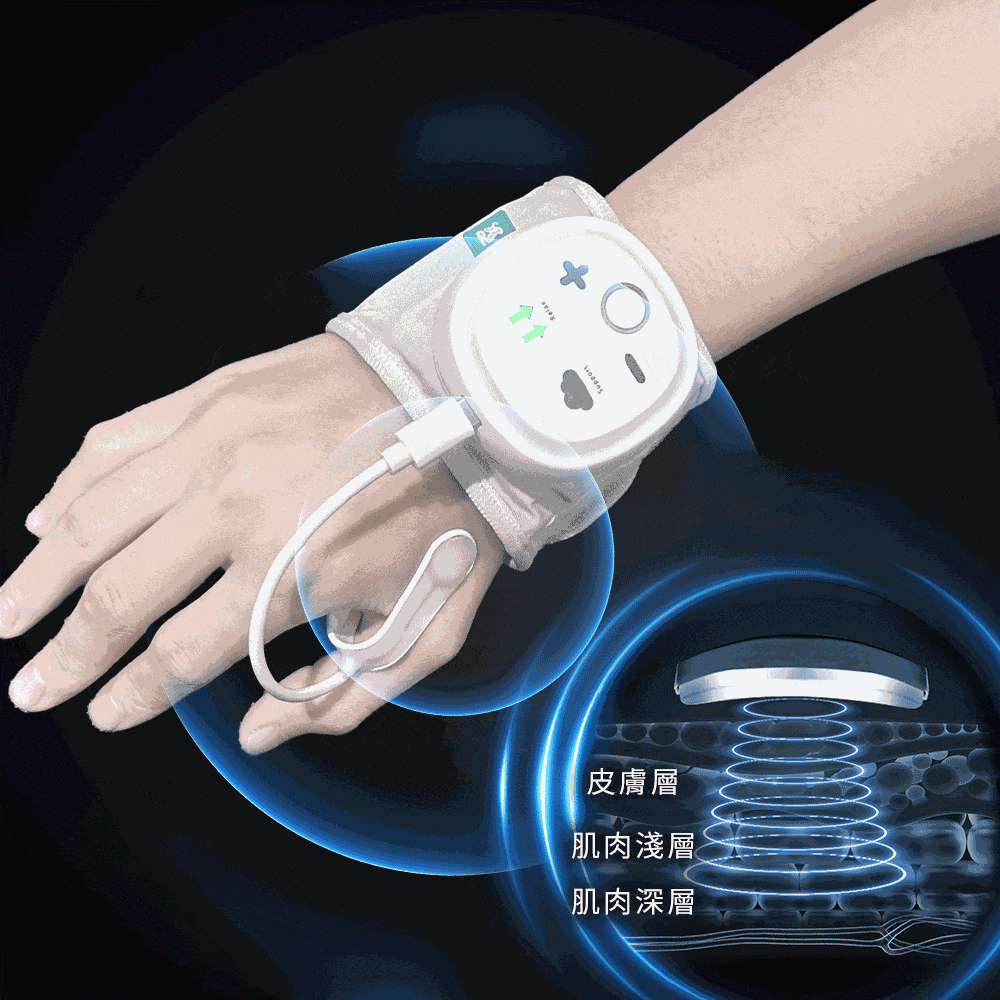 微電流按摩夾搭配手腕下側帶按摩凸點,按摩的同時直擊手部周遭穴位,進行更深層的肌肉放鬆,不僅能有效舒緩疲勞,還能達到提神與養生的雙重保健效果