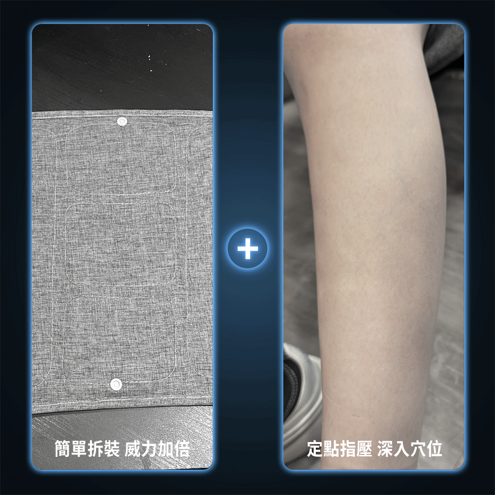 可拆裝指壓墊,可連接在按摩器內側,氣囊運動帶動指壓墊按摩小腿肌,精準按模痠脹點,針對性按摩更舒暢!