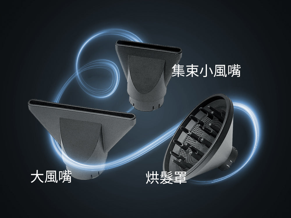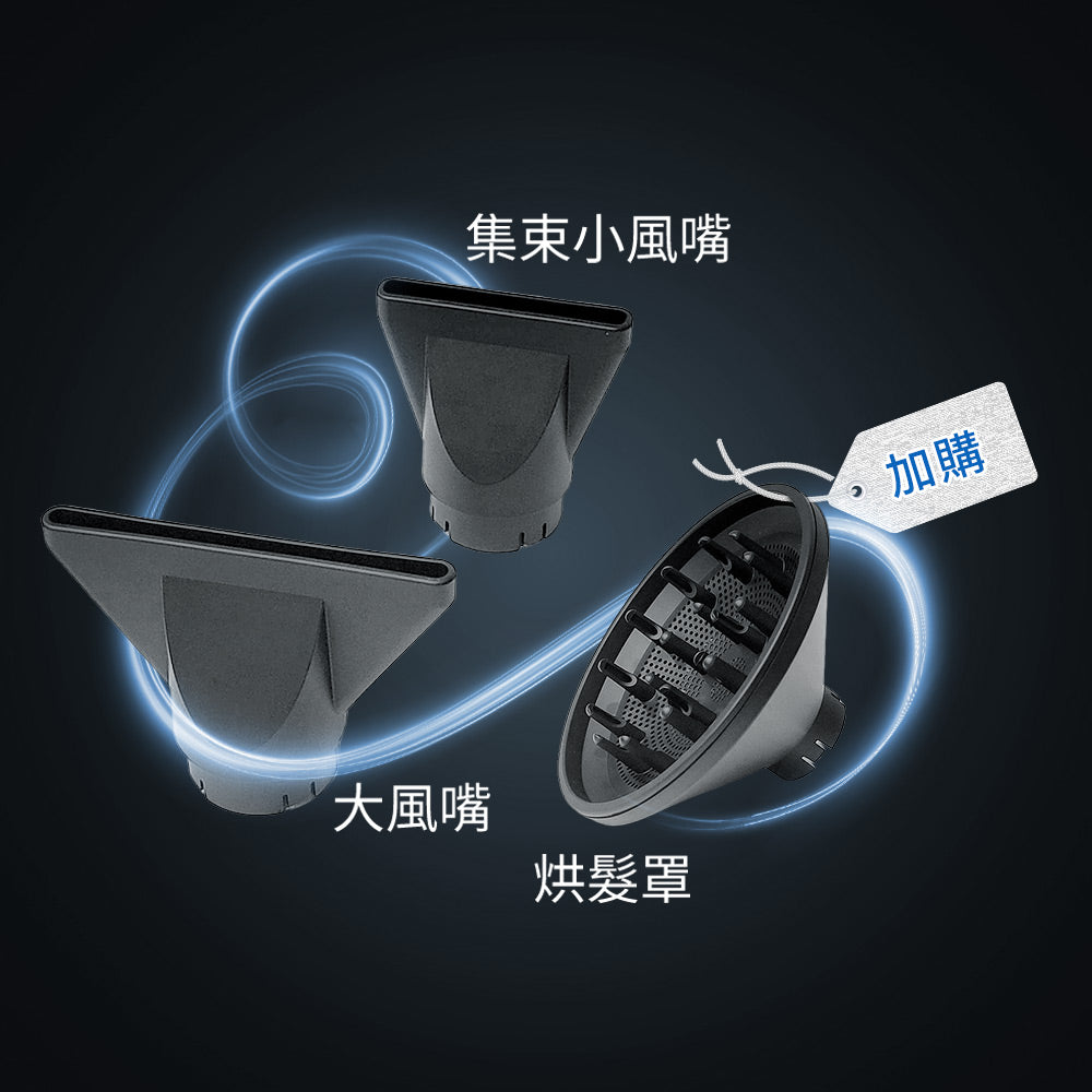 內附贈一個大吹嘴,集風口設計加速吹乾秀髮。小吹嘴高速吹乾頭髮,集中吹整髮型,採用耐高溫材質,安全不燙手,讓你吹髮造型一次完成! 加購獨家專屬烘髮罩,集風效果佳,導熱快,深入髮根,提升捲髮線條、減少頭髮毛燥!