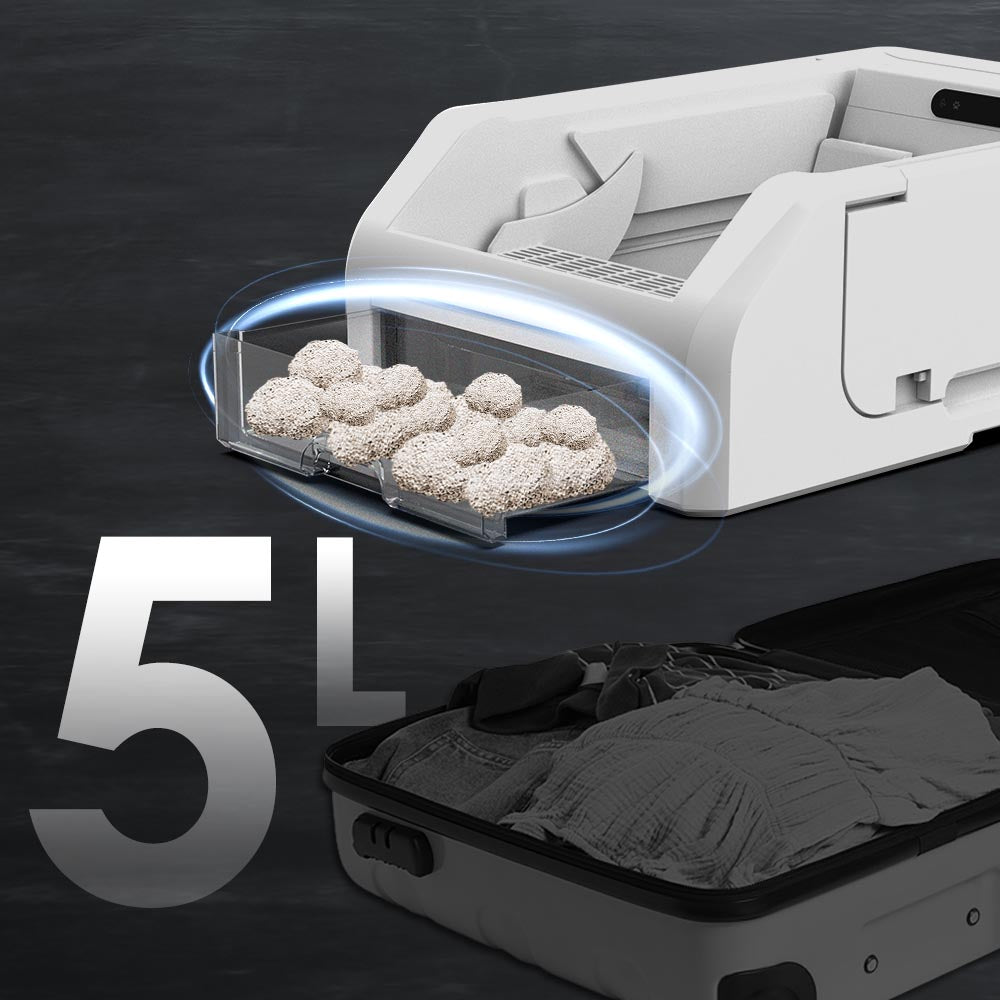 5L大容量集便盒,10天才需整理一次,外出超安心!平推式集便方式,有效提升容量使用率;刮砂上蓋可將餘砂二次回收利用,節約用砂不浪費。