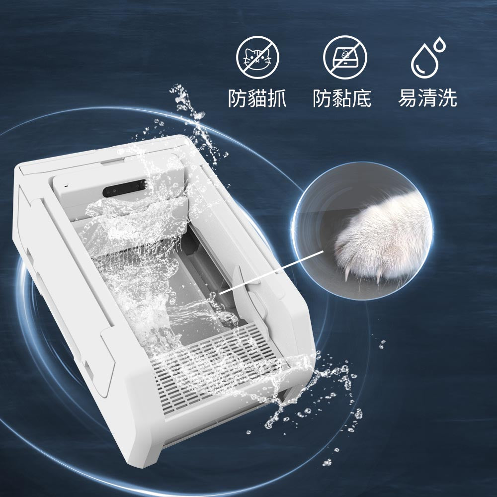 機體巧妙的分離設計,使之能輕鬆水洗、拆卸、安裝。砂盆底部採用防沾黏清洗墊,髒汙不黏底更容易清潔,隨時提供貓咪乾淨衛生的環境。