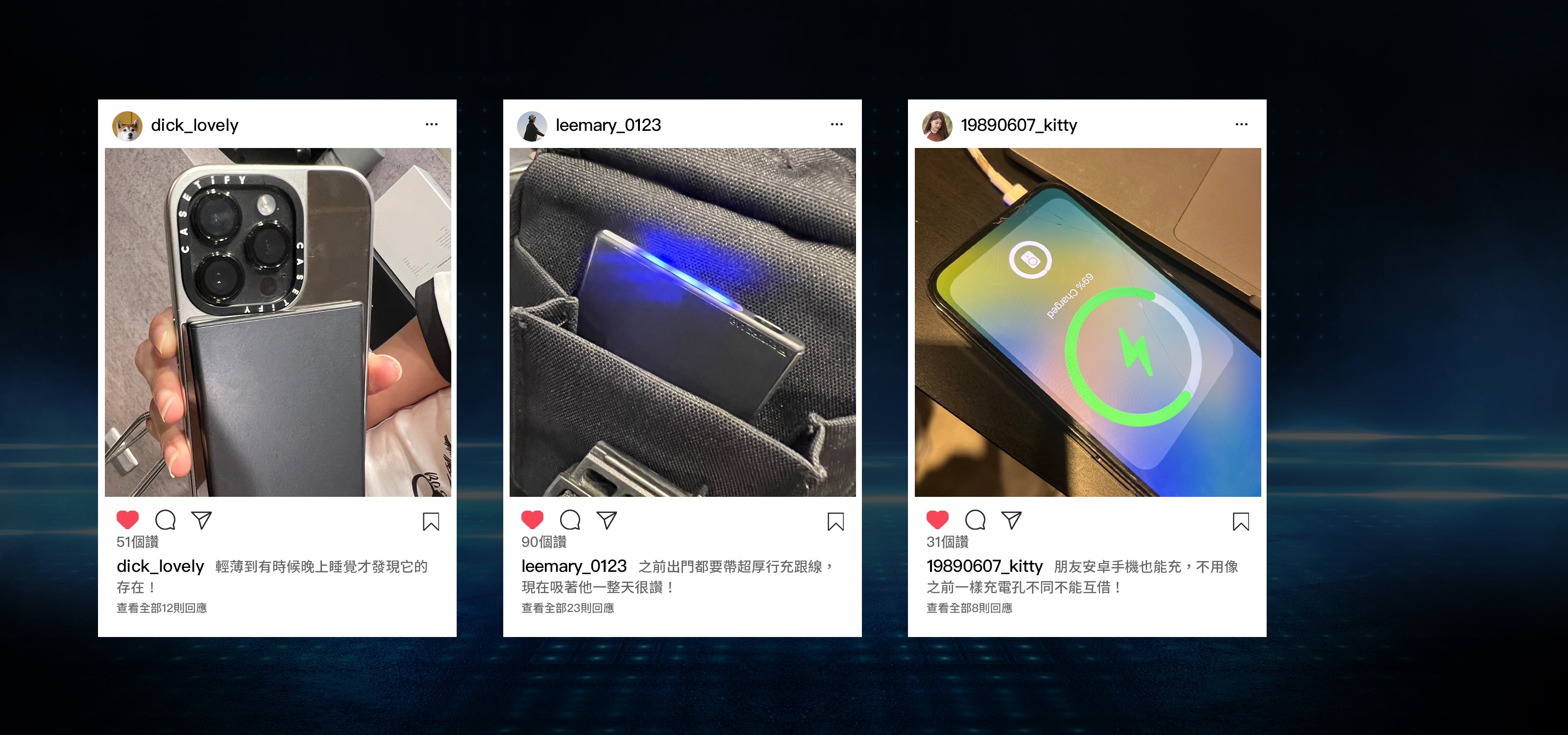 設計團隊耗時設計一款比手機更薄的電源卡,不在加厚手機握取負擔,甚至像沒裝一般輕鬆攜帶,且獨家設計質感造型,針對各個機型及手機殼都能完美貼合,不突兀、不突出的極致美感!