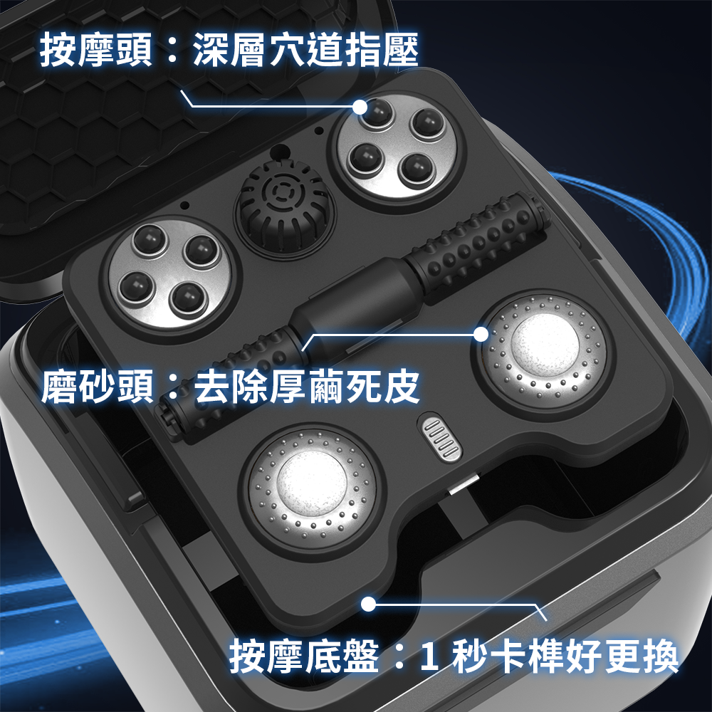 按摩底盤向上直接取出,清洗整理不費力!磨砂、按摩全功能配件一秒更換。