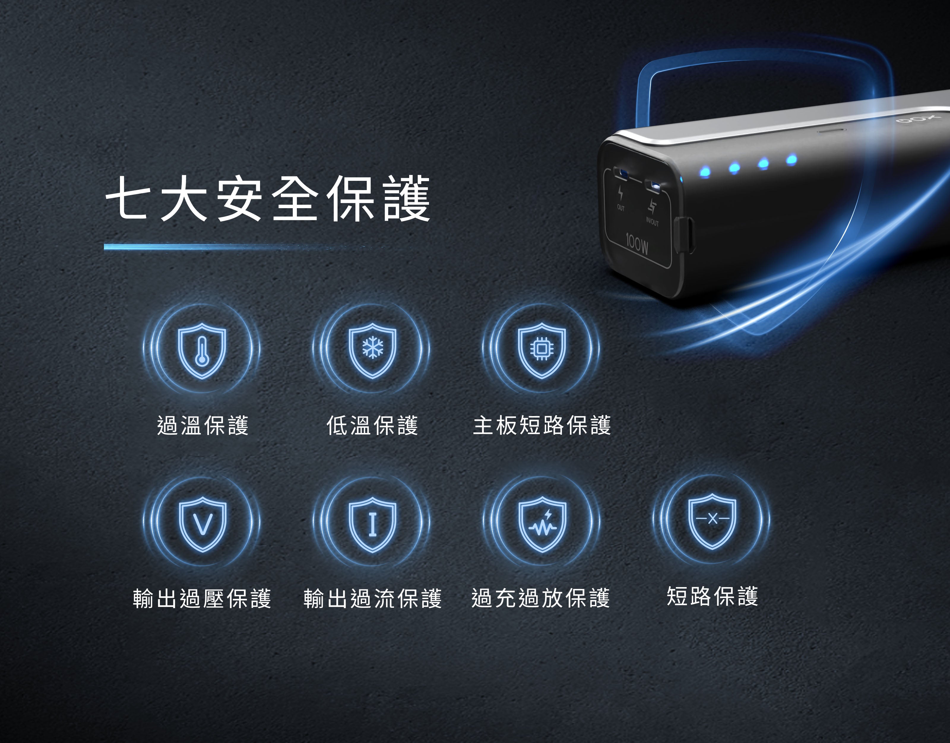 主機板內建NTC控溫,隨時偵測電池溫度,充電時溫度過高,自動減緩充電電流,迅速降溫,以防電線短路。NTC控溫機制偵測到環境溫度升高,會快速降溫、自主斷電,保護您的人身安全、設備安全,讓你安芯快充無煩惱。