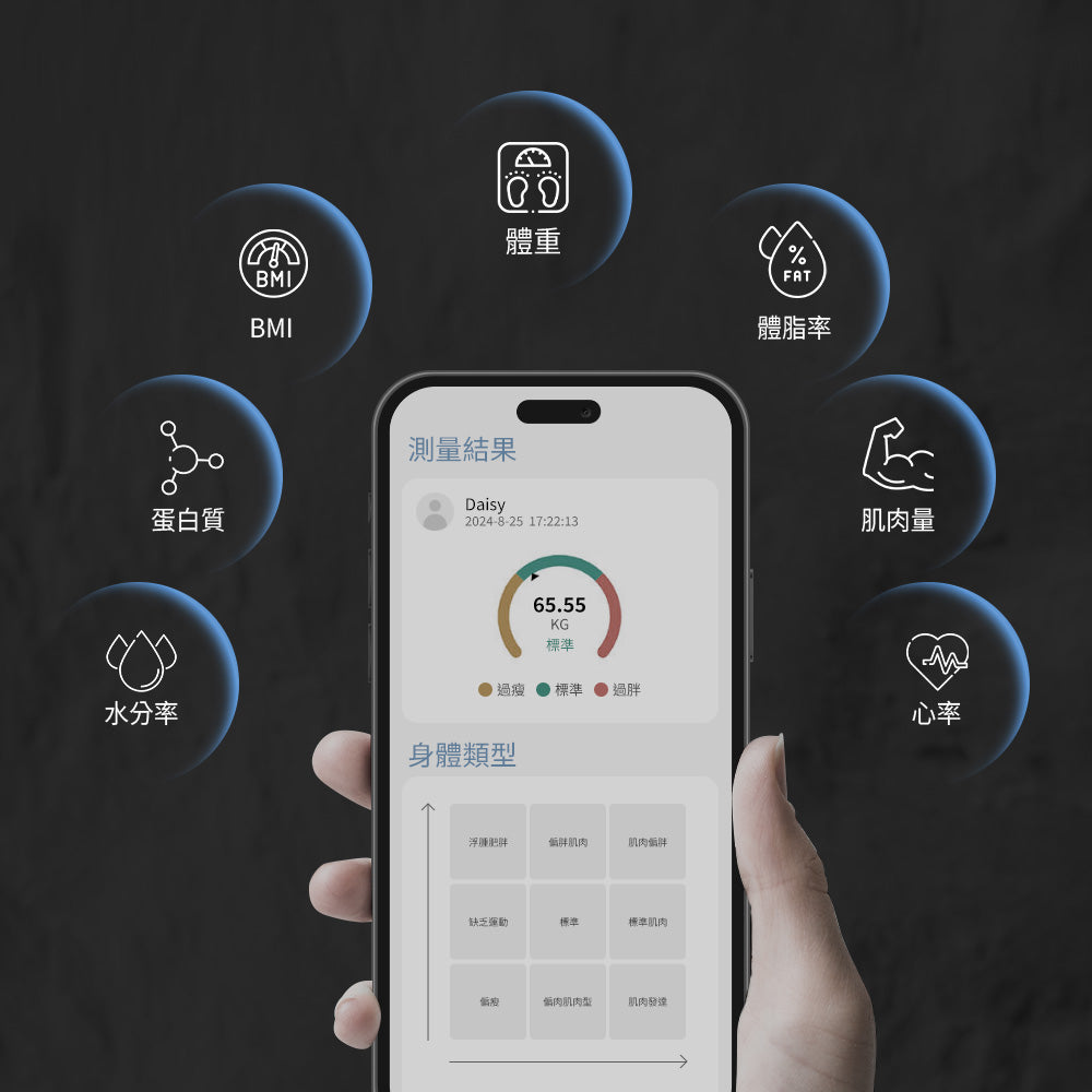 內建52項綜合指標檢測,讓您在家即可量測出貼近醫療級的精準結果。搭配3.5吋LED大螢幕,即時顯示基本數據,並將詳細資訊同步傳輸至專屬APP,提供專屬解析報告。