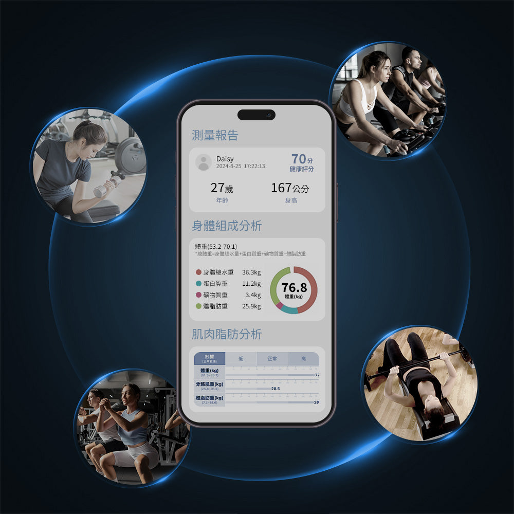 清晰展現各部位脂肪及肌肉數據,身體變化一目了然,協助你的訓練對症下藥。