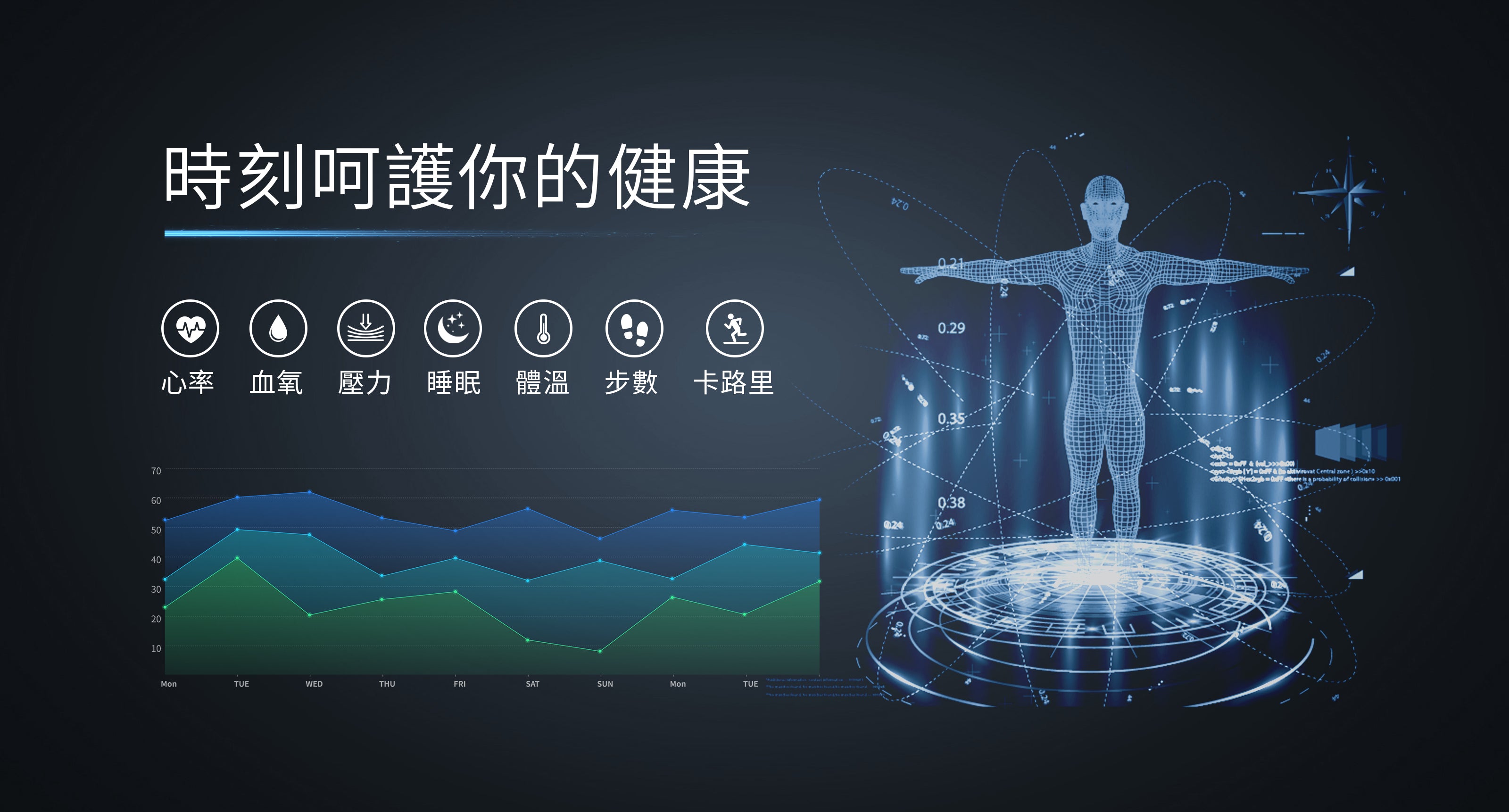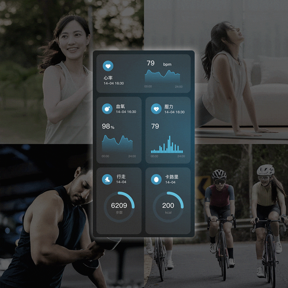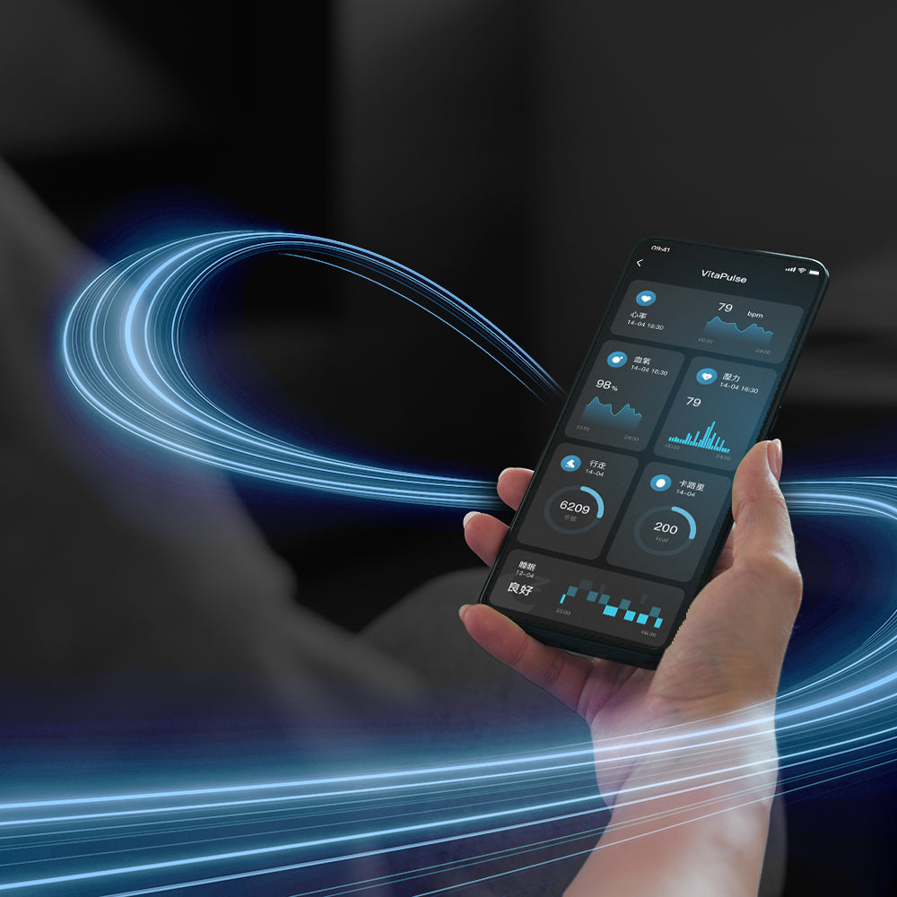 透過傳感器自動取得各項身體指標,並運用AI演算法獲得更貼近醫療級設備準確率的數據;更可以科學管理身體狀態、提供專業的個人報告。