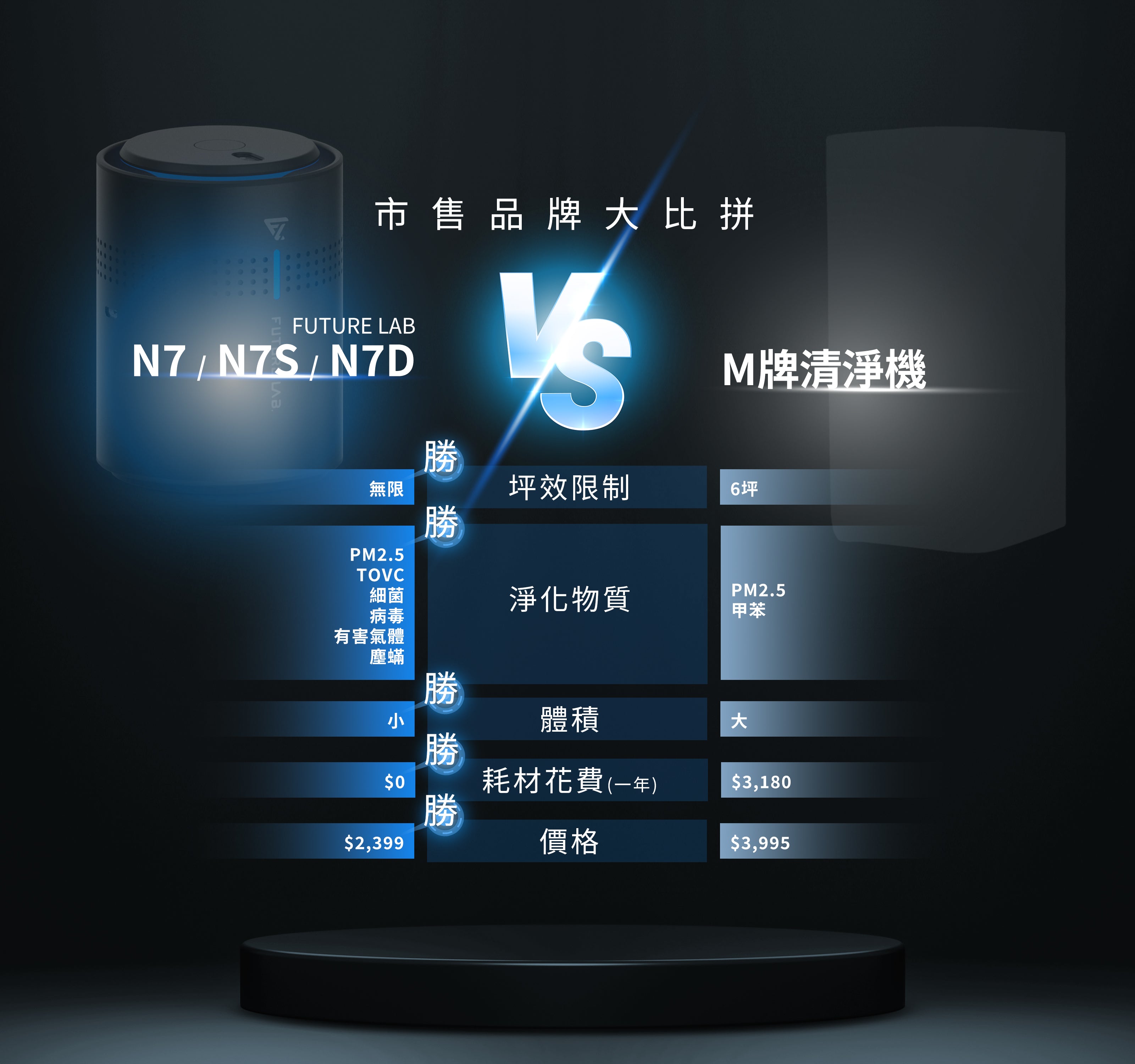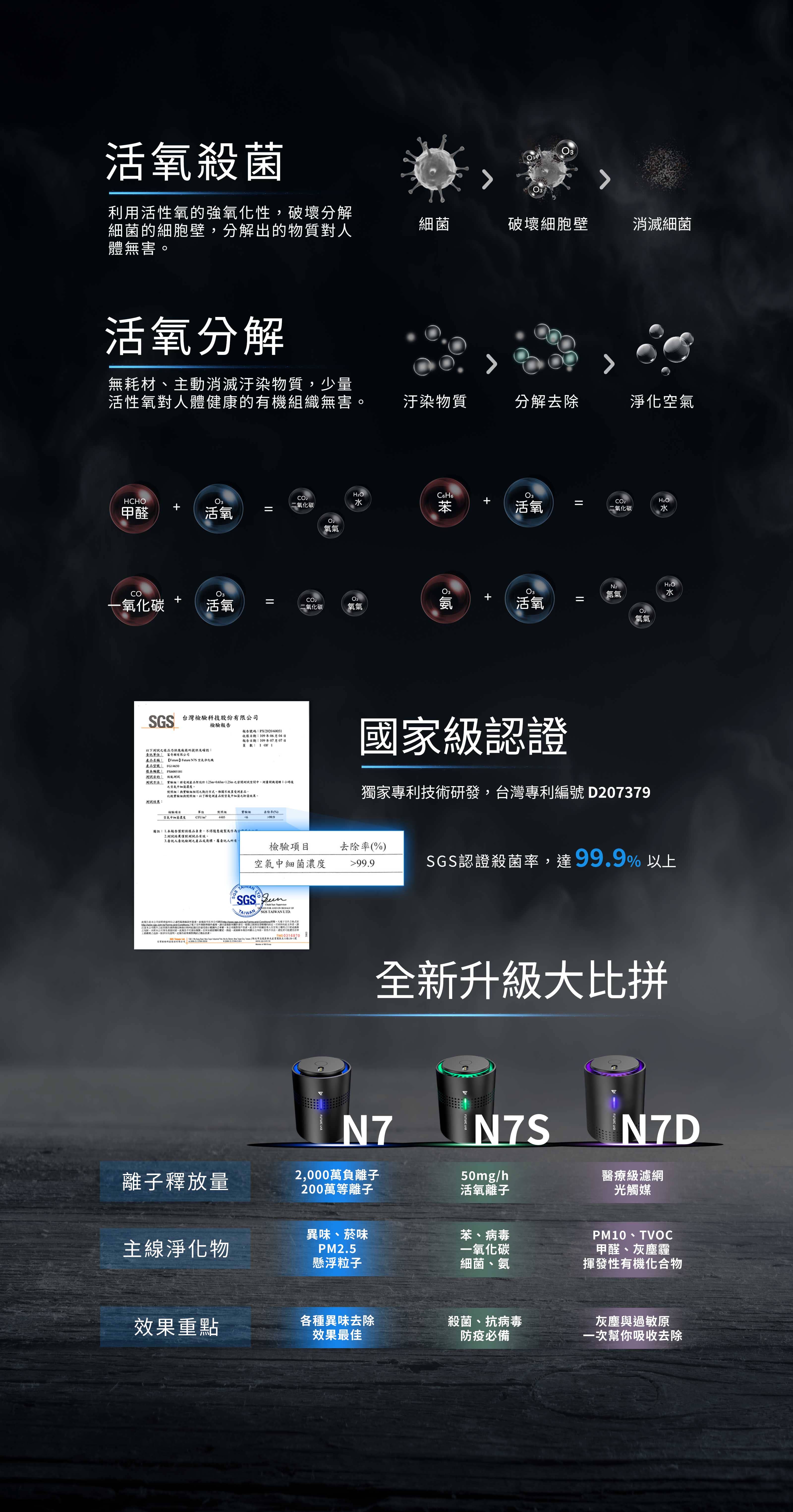 將笨重的傳統空氣清淨機輕量化,運用了負離子、光觸媒濾網及臭氧等先進技術,將它們自由堆疊,研發出全能N7空氣清淨機。