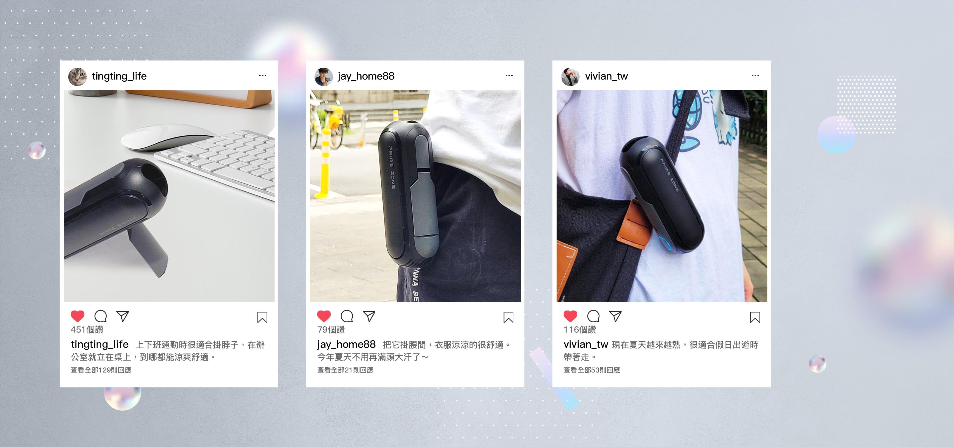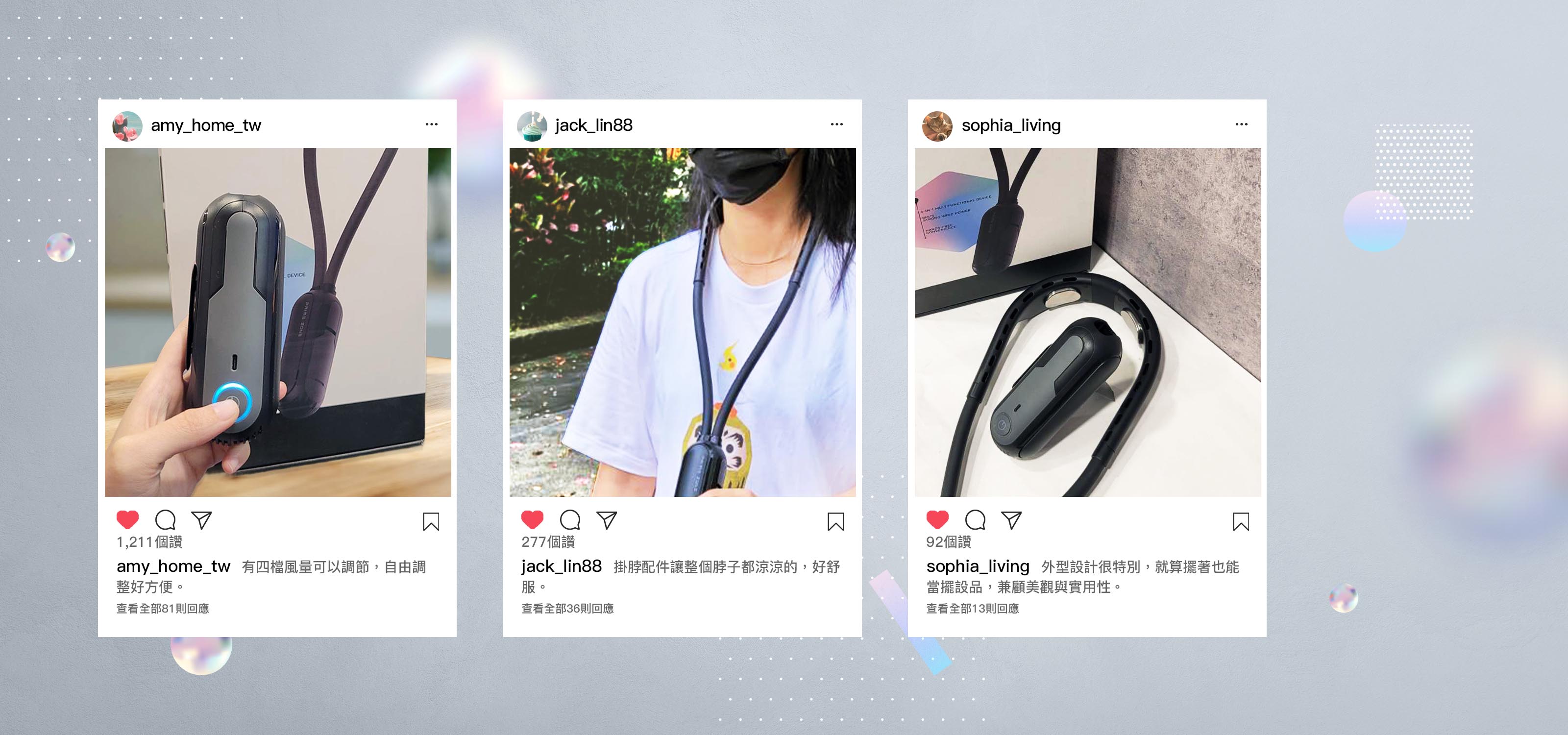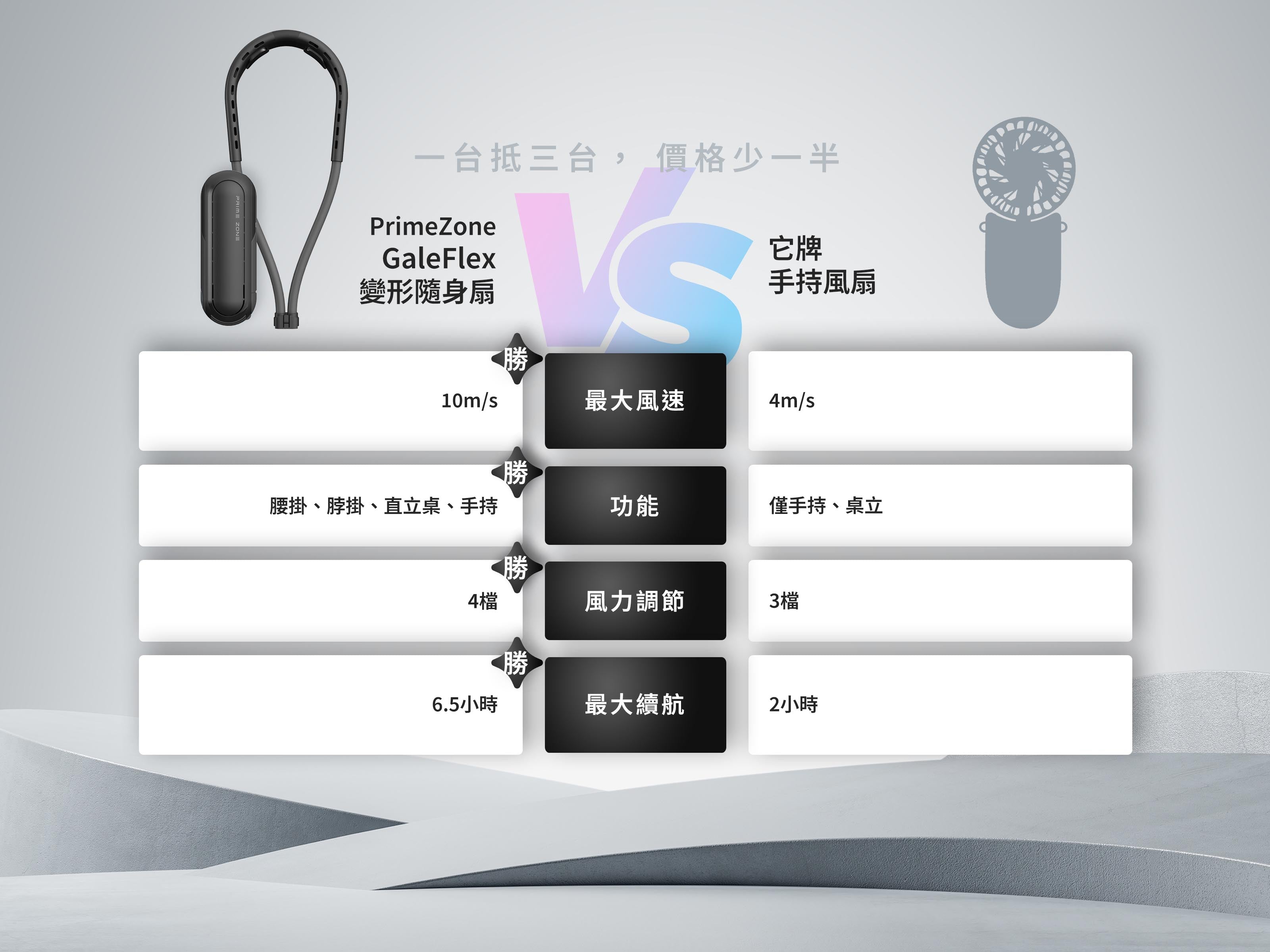 搭配掛脖配件,出風孔洞數量多且環繞至雙頰,並均勻分布頸間吹彿,有別於市面上最熱的後頸無出風孔的窘境,且最大風速10m/s,再也不怕發汗的頸後吹不到風了。