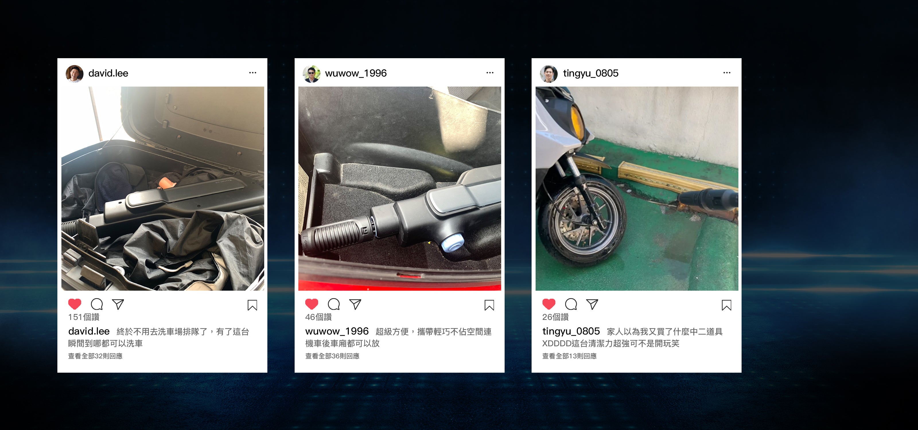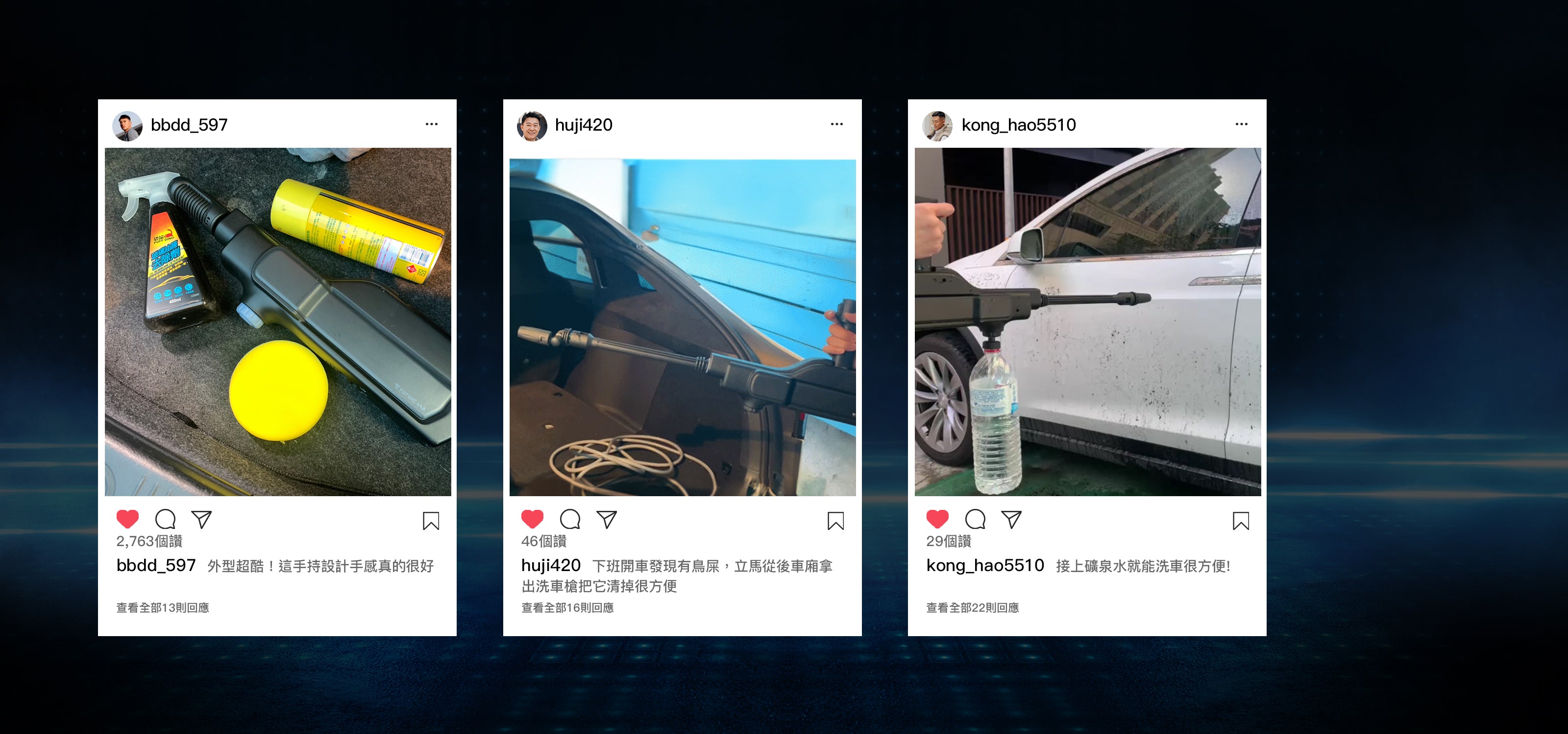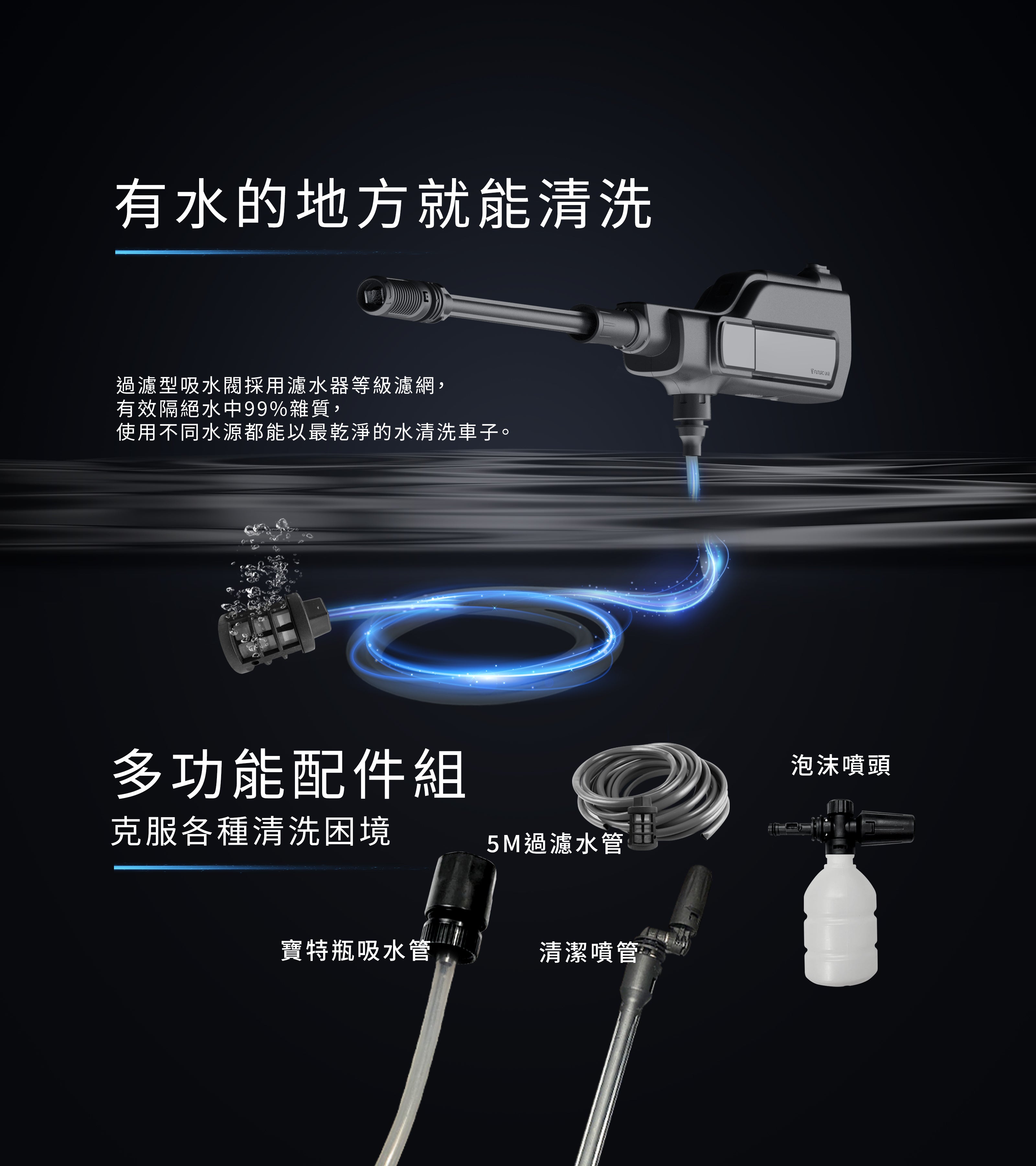 天氣好洗車再也不用排隊!超越水源、空間、電源限制,提供消費者隨時隨地自由清洗的最佳方案,結合強勁壓縮馬達、濾水吸水閥以及高續航電力展現超強機動性,簡單接上一瓶礦泉水也能清洗好一台車,為現代人解決繁瑣的清潔困擾。