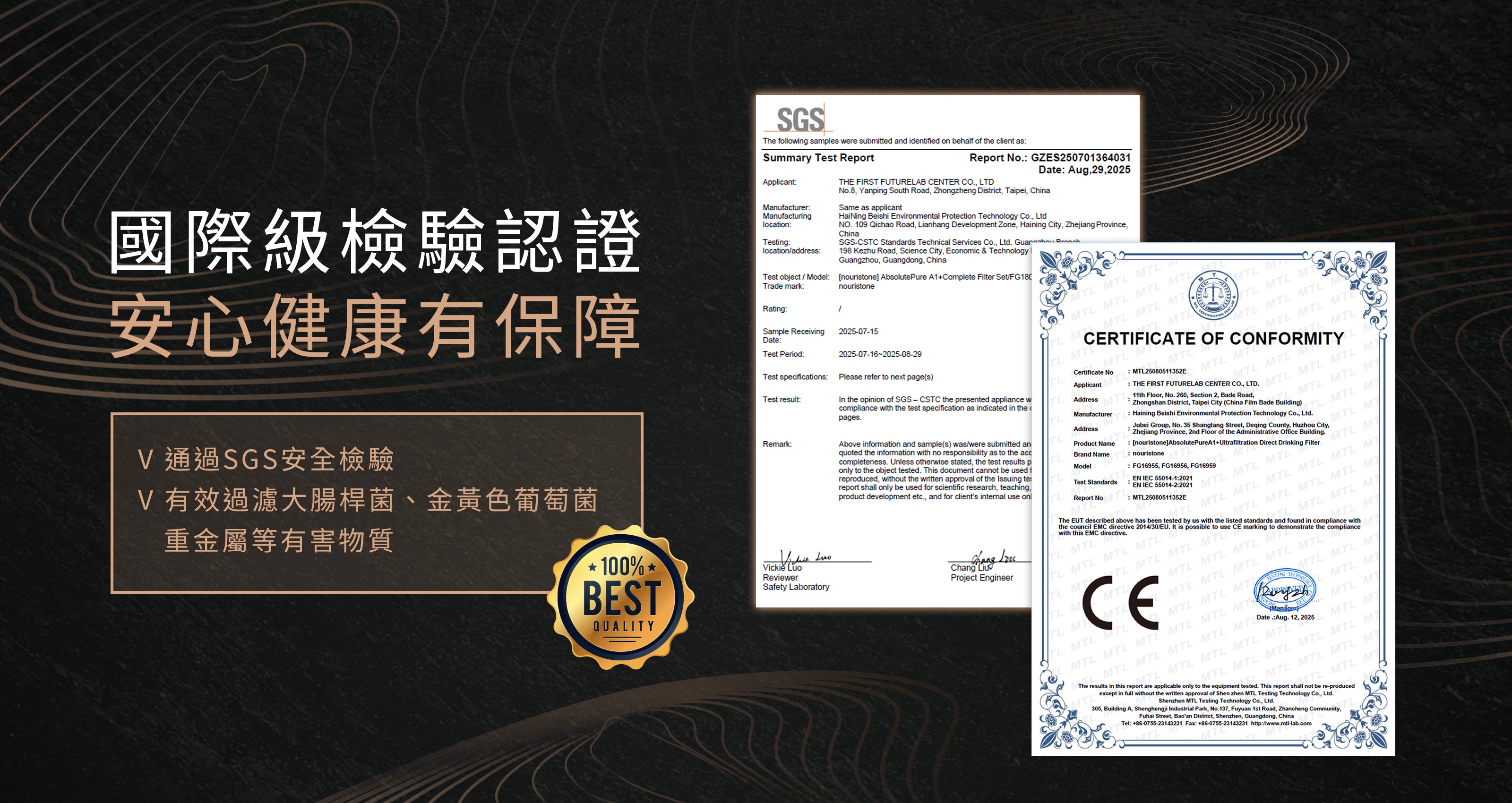 *本產品通過 TPL 台灣衛材開發與測試研究所之型式試驗報告,符合飲用水質檢測標準。詳細報告內容請見檢驗報告。