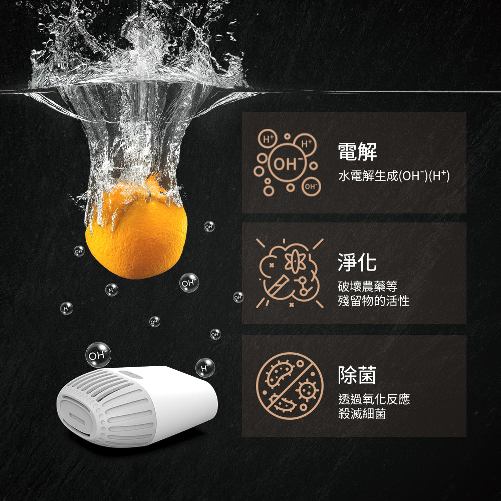 自來水電解後產生的離子活性物質,可以有效清潔食材,實現「0耗材、0添加、0汙染」。相較市售蔬果清潔劑更無限制,酸鹼農藥皆可順利清潔,同時不會影響食材的口感和營養。