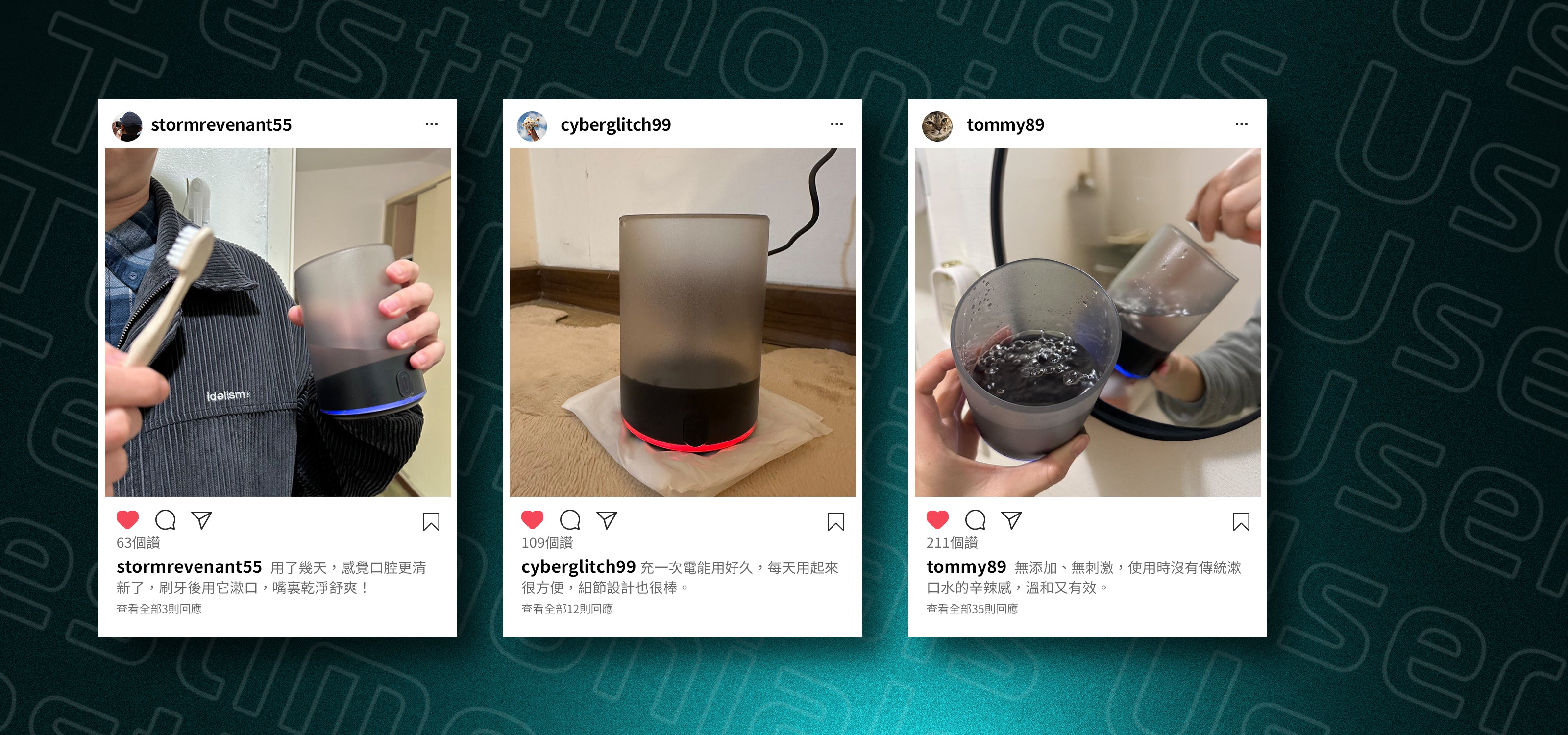 我們設計這款可以無耗材的方式持續製造活氧水的漱口杯,讓消費者可以隨時隨刻在有水的地方就有活氧水,輕鬆維護好口腔健康。