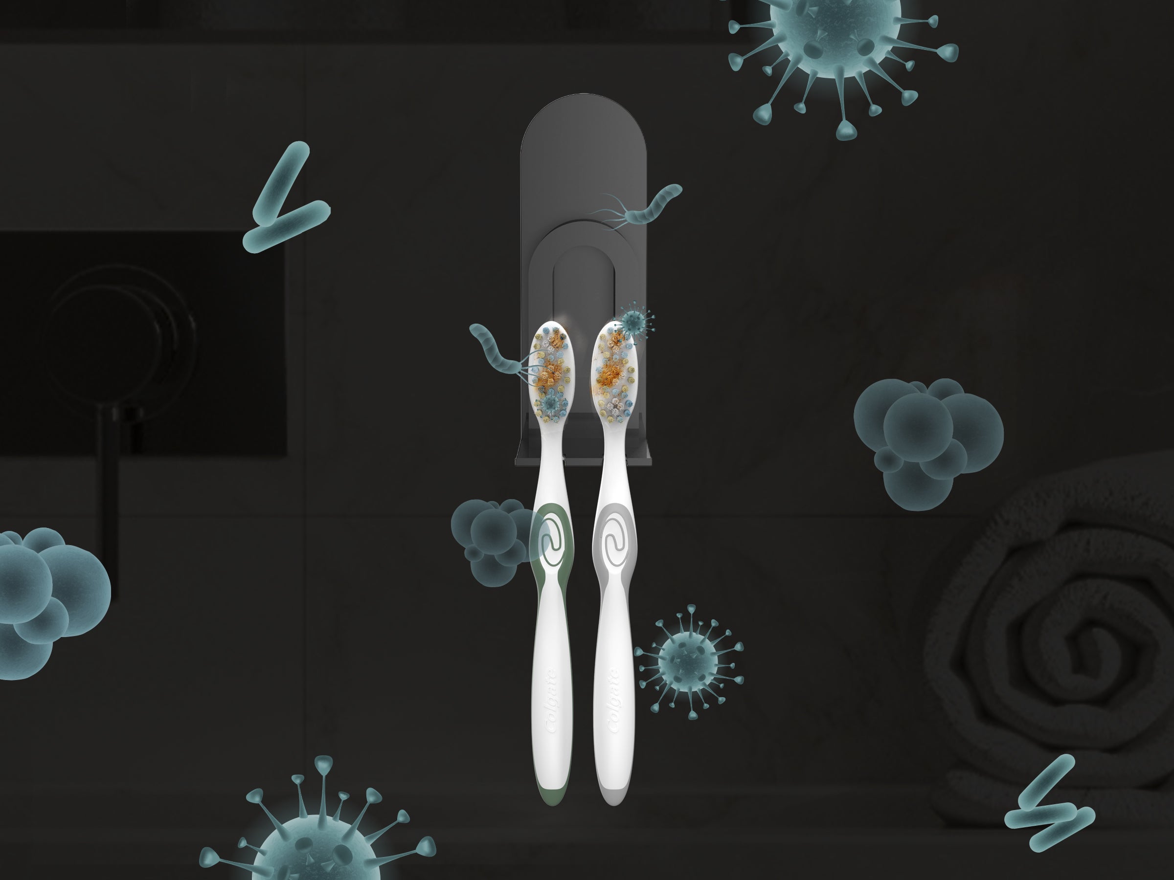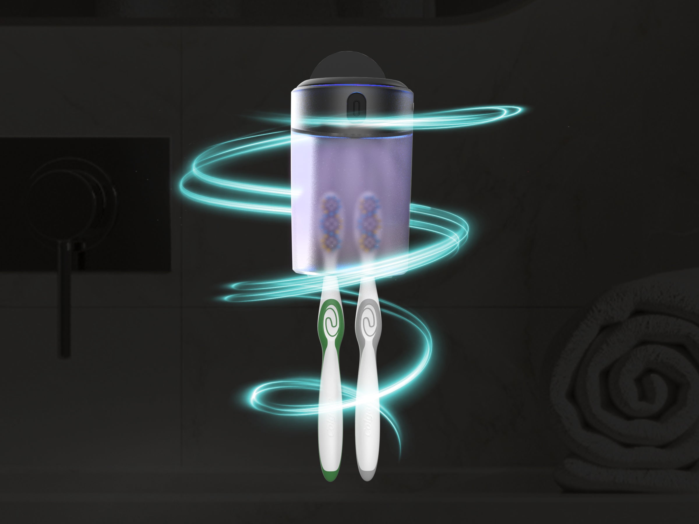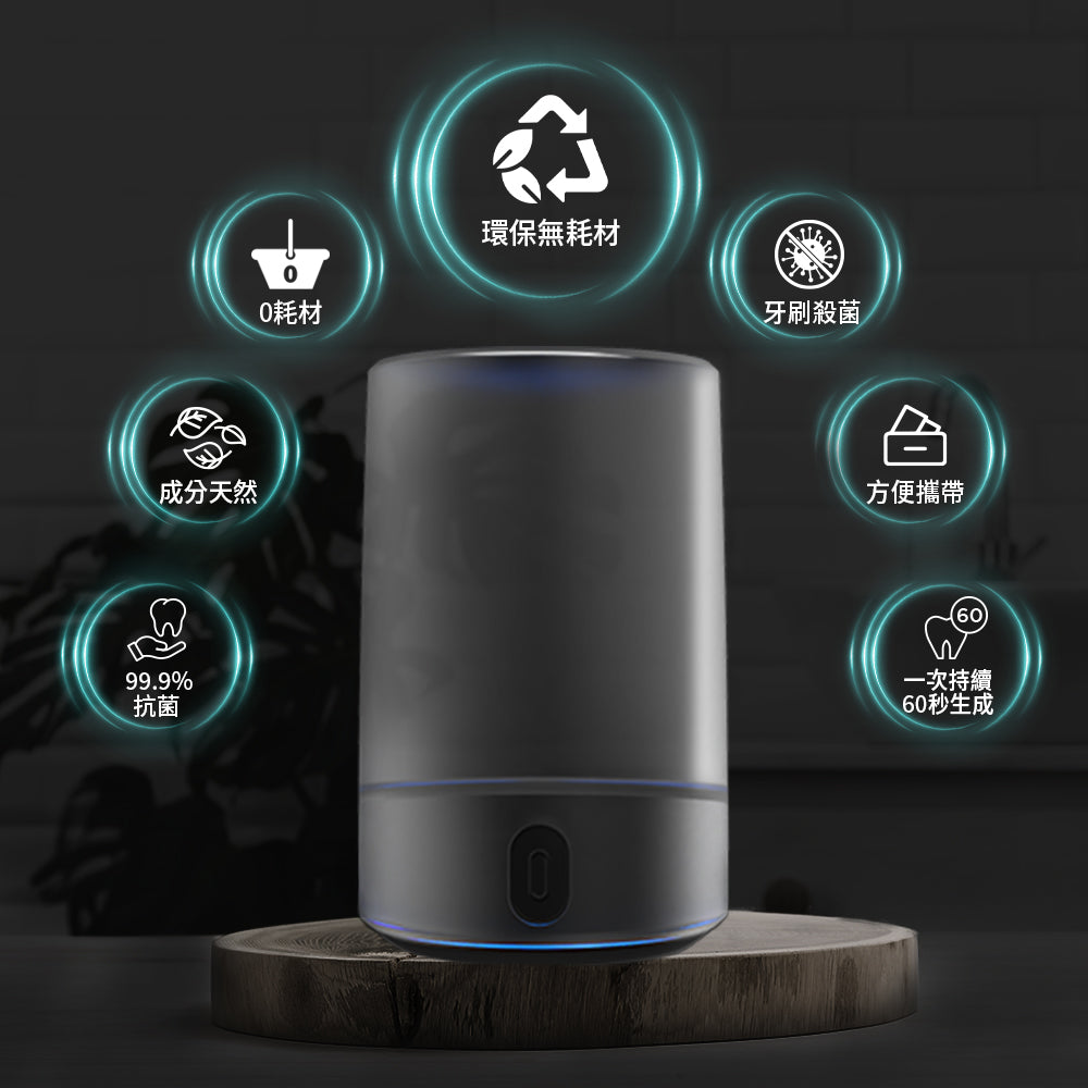 倒扣掛於牙刷架時可散發活氧氣體,同時替牙刷及水杯殺菌,快速去除牙刷刷毛中病毒、細菌,同時預防水杯生成水垢、黴菌。