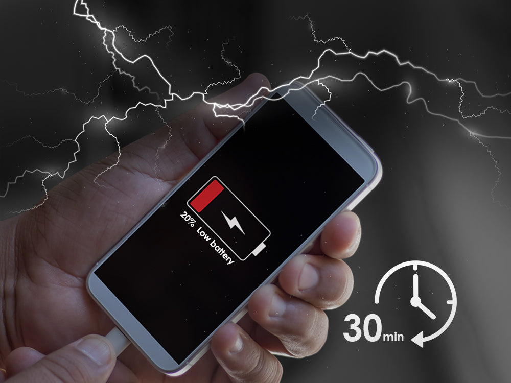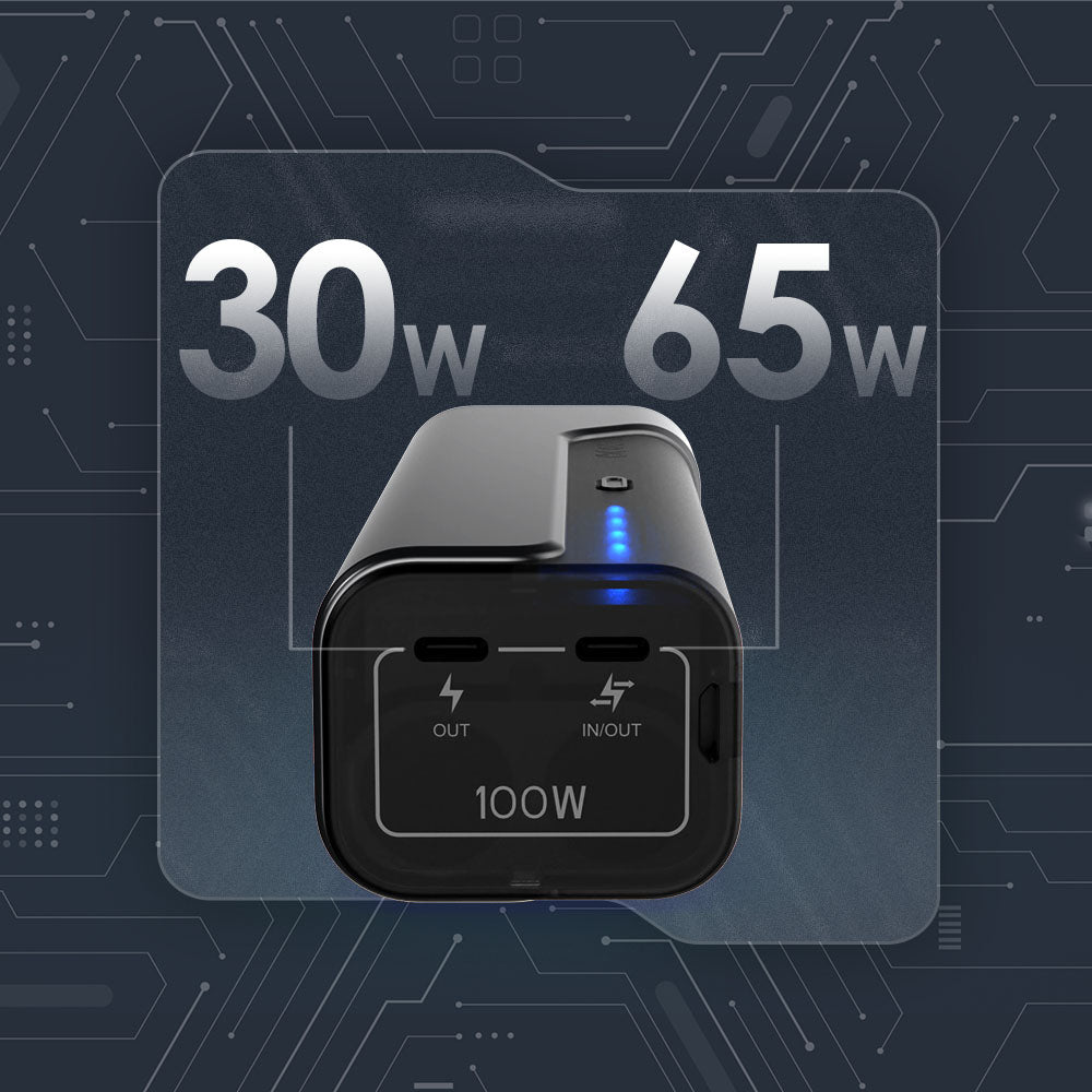 單孔使用極速100W不降速,雙孔同時使用,功率動態分配,一孔65W、搭配30W,兩孔同時快充,極速支援,開會工作、休息看影片、打手遊都不斷電。