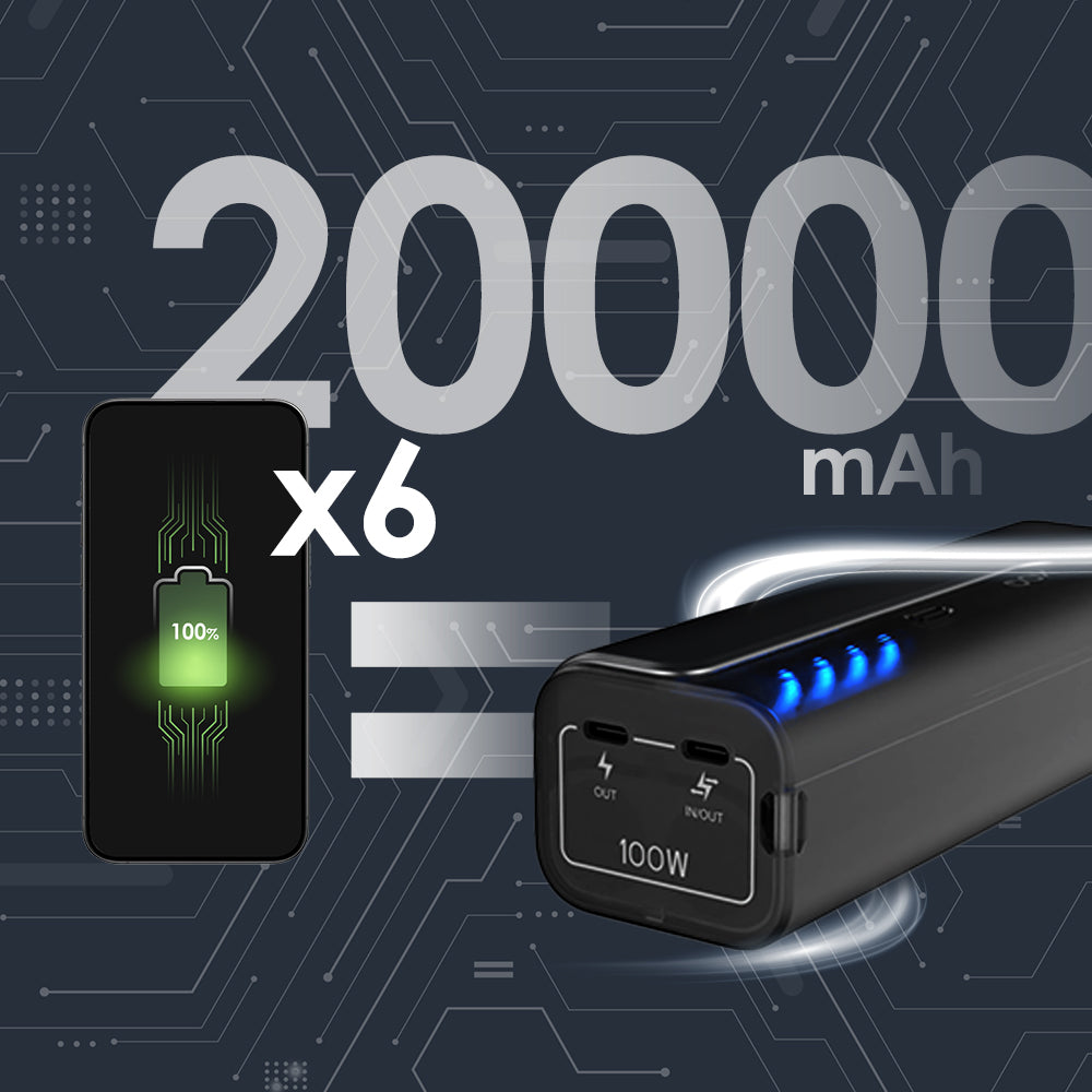 2萬毫安時,充飽6台手機,長時間外出旅遊辦公,攝影、工作都輕鬆完成,支援筆電等大功率的行動續航需求。