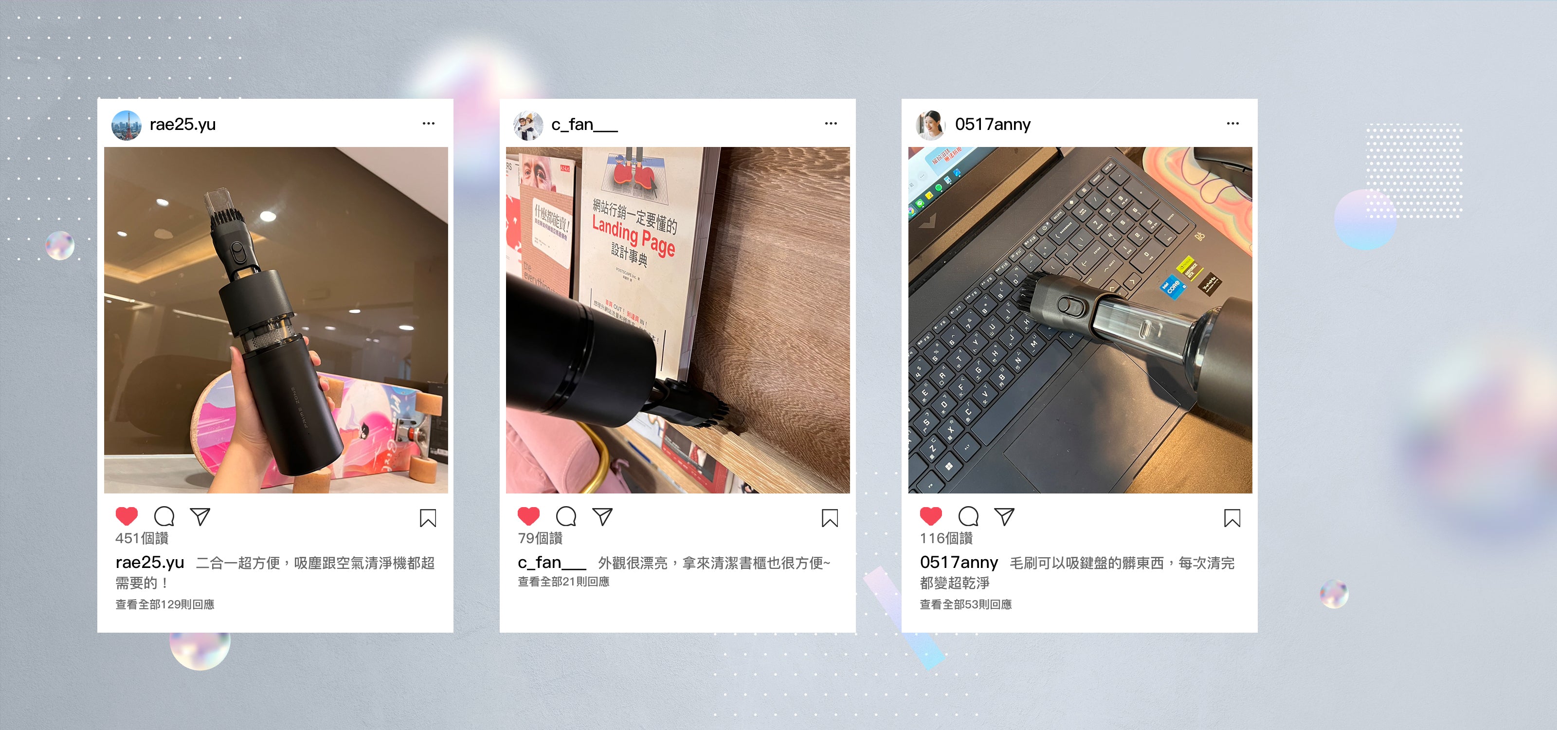小巧體積易攜帶,方便放置在車內杯架空間、車門側邊、房間、衣櫃,隨手清潔超方便;重量輕而易舉,單手手持好清潔,久用也不手痠。