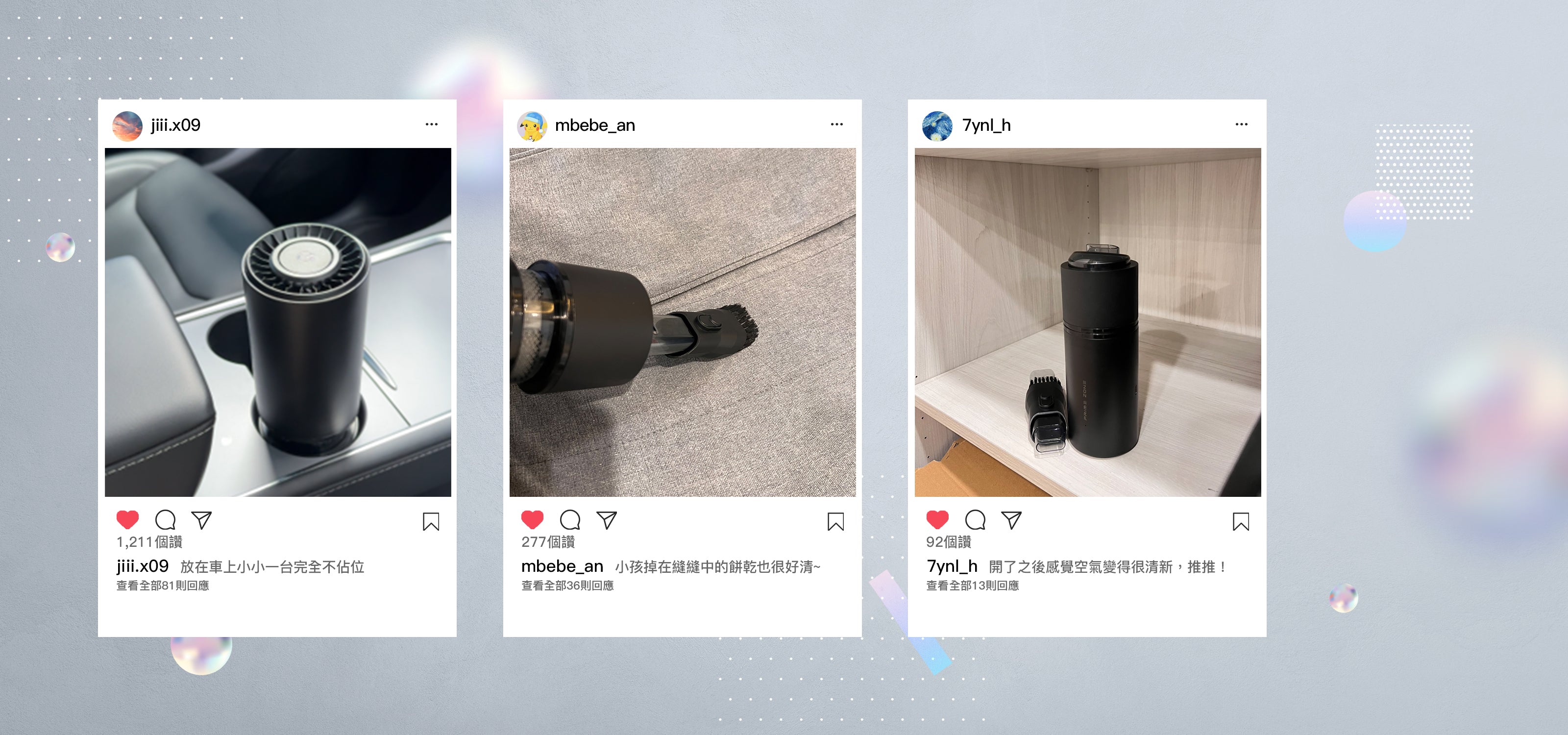 快速淨化家中異味、化學塗料 / 空氣中灰塵、懸浮細菌 / 汽車室內外換氣與吸進的灰塵霧霾;只要一機,就能有效的清除身邊所有髒空氣。