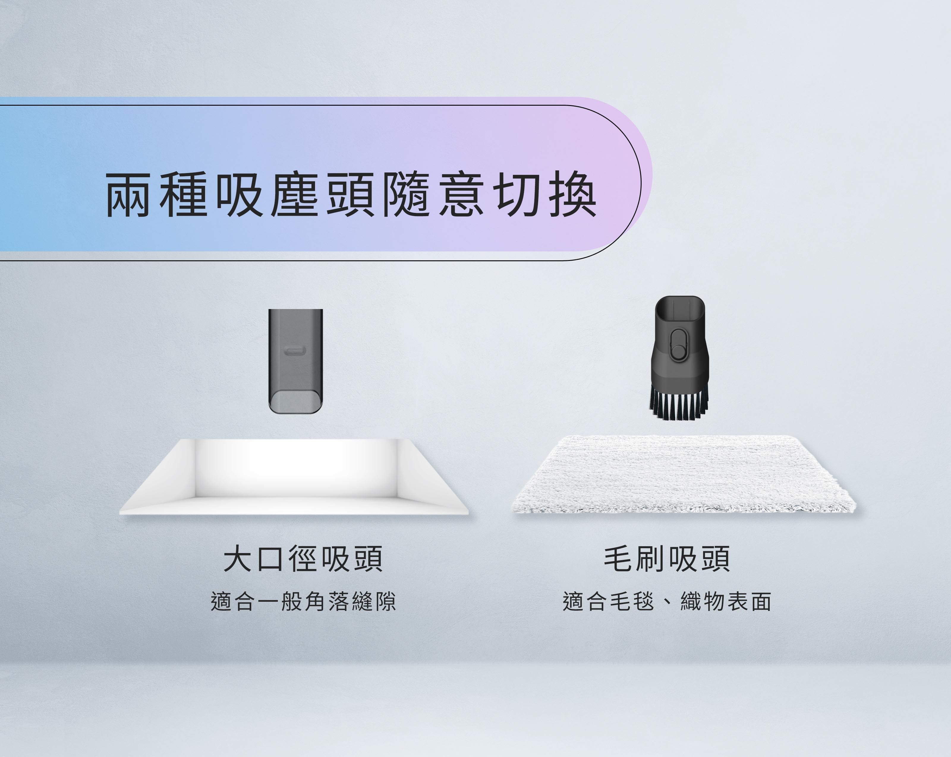 大口徑吸頭,大範圍清潔更快速;毛刷吸頭吸附玻璃表面、毛毯卡塵,小細節蒐集縫隙灰塵,車內家用都適用。高效吸入微塵,不易產生揚塵,避免二次汙染!
