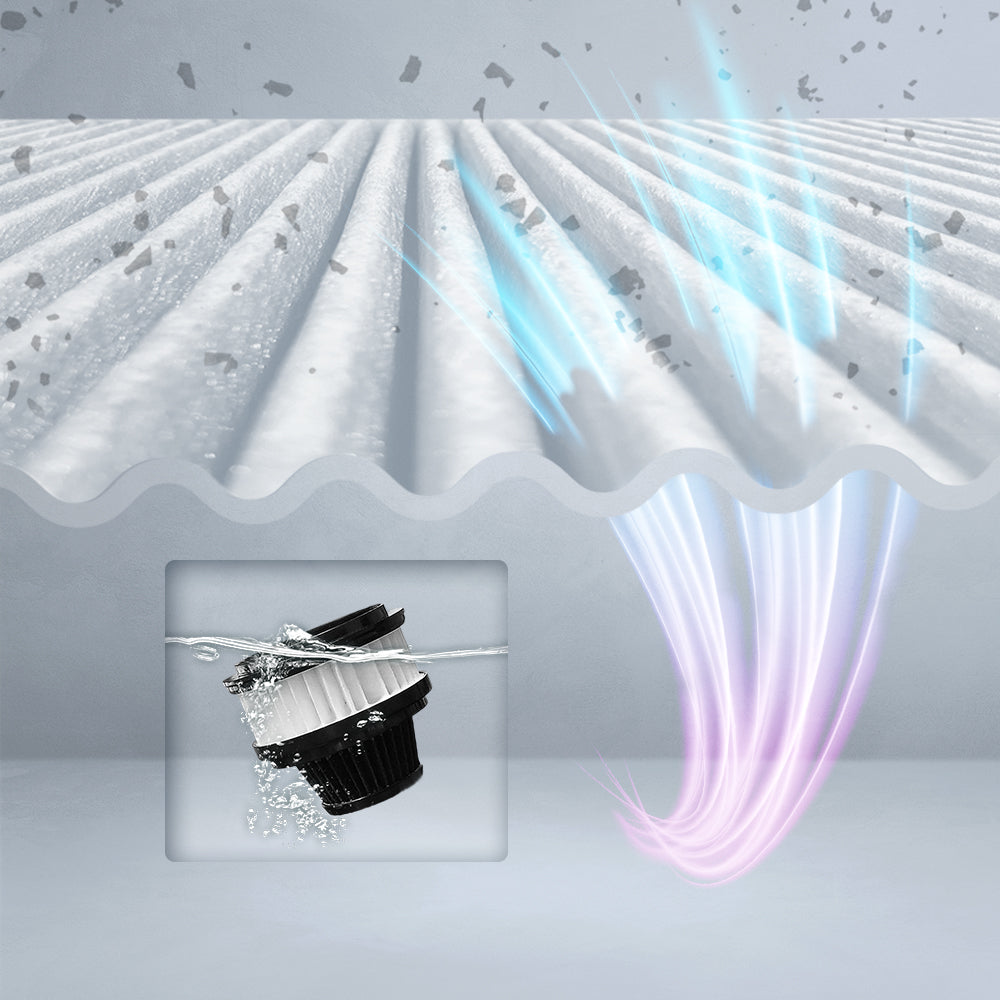使用頂級水洗式 HEPA 11 濾網,使用奈米級纖維編織,強化了吸附灰塵髒汙功效;濾網髒了僅需利用清水沖刷,省下更換耗材的費用。