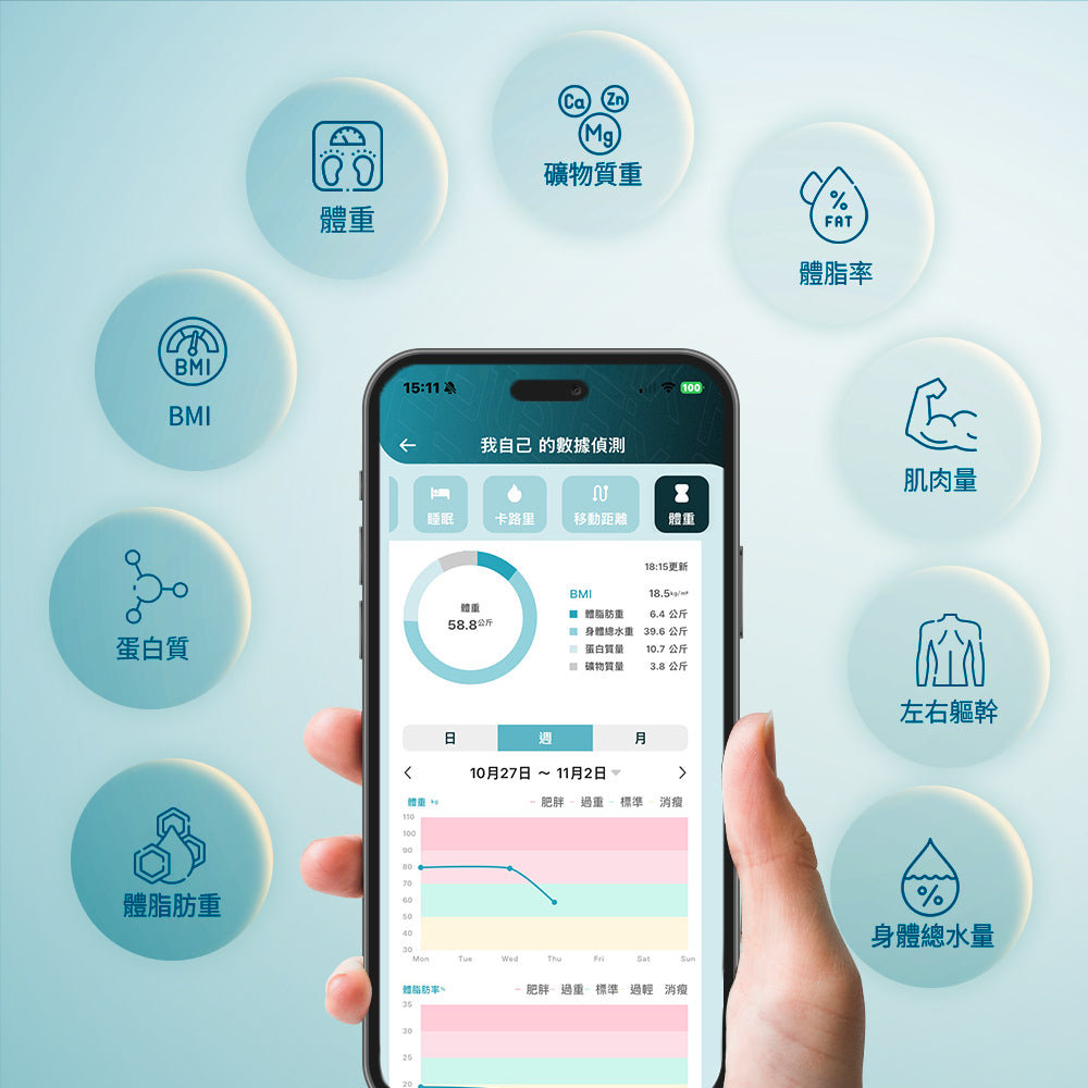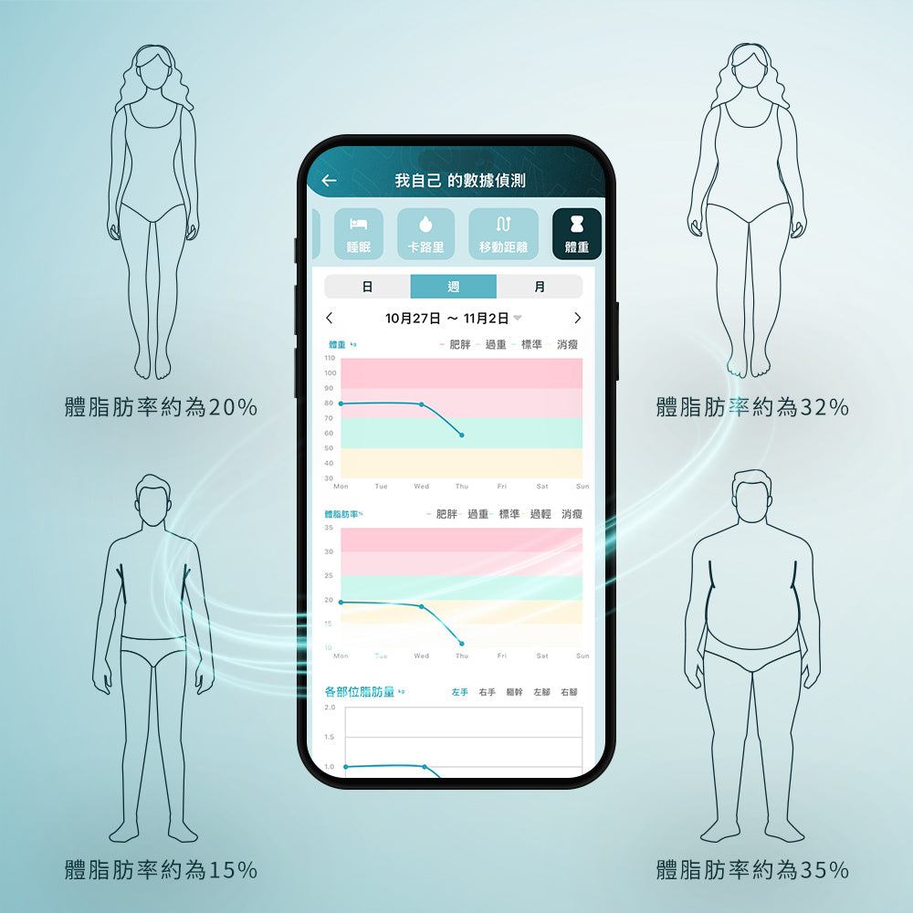 身體的組成比例會大大影響外型!脂肪的體積約為肌肉的三倍,因此在相同的身高和體重下,脂肪率越低,身形通常也會顯得更精實。App會根據您的量測結果,清楚呈現脂肪率與變化趨勢,並標示所屬的狀態區間(如標準、過重或肥胖)。透過直覺的圖表與趨勢線,您能更容易掌握身體組成的改善方向,讓每一次的訓練或生活調整都更有依據。