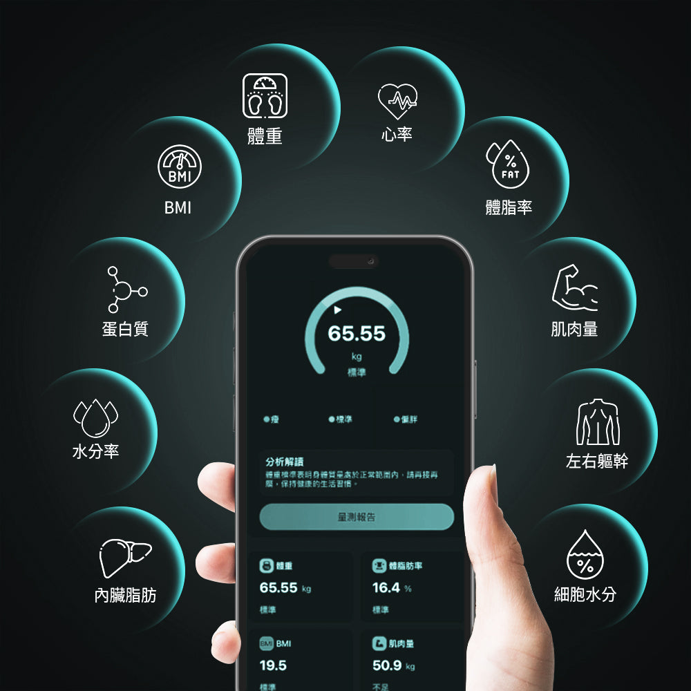 內建52項綜合指標檢測,讓您在家即可量測出貼近醫療級的精準結果。體脂秤配載3.5吋LED大螢幕,即時顯示基本數據,並將詳細資訊同步傳輸至專屬APP,提供專屬解析報告。
