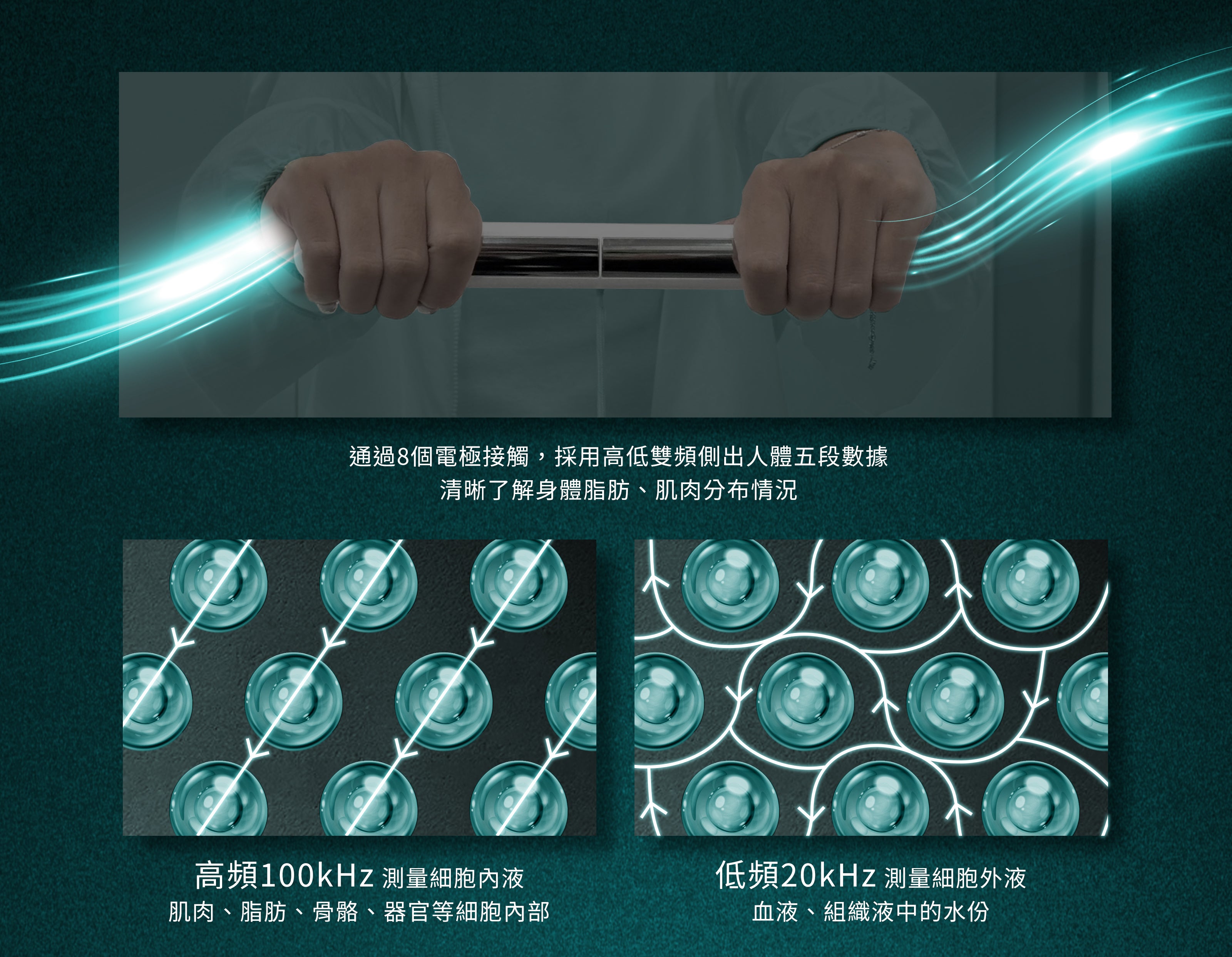 有別於一般腳踩四點式體脂計,八點式利用電極傳導,上下身分段式測量,僅需30秒立刻量出全身精準數據。
