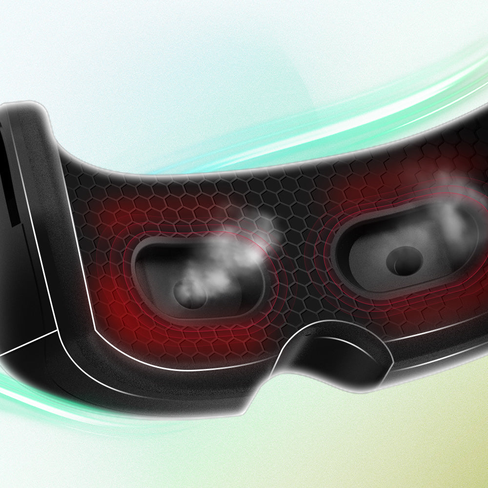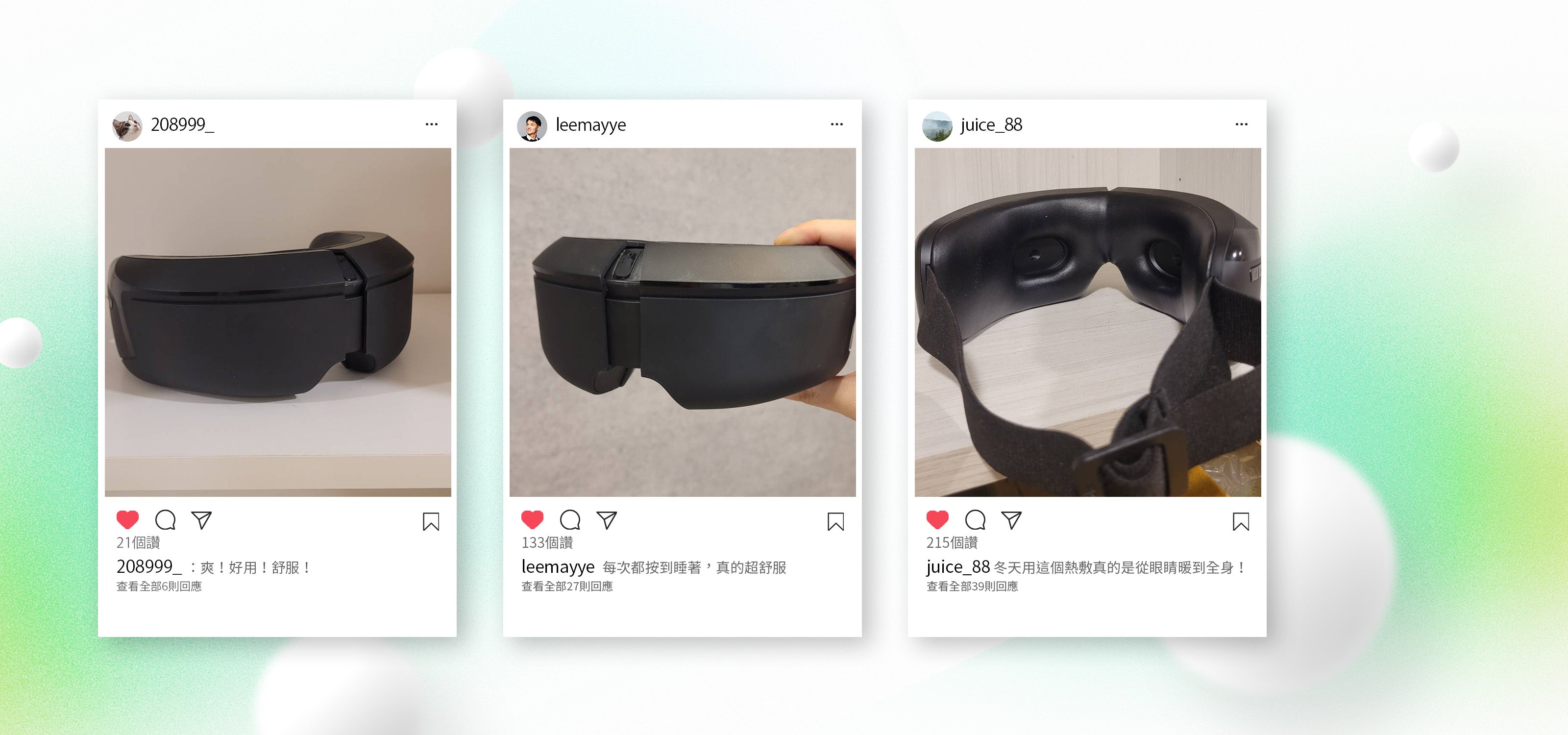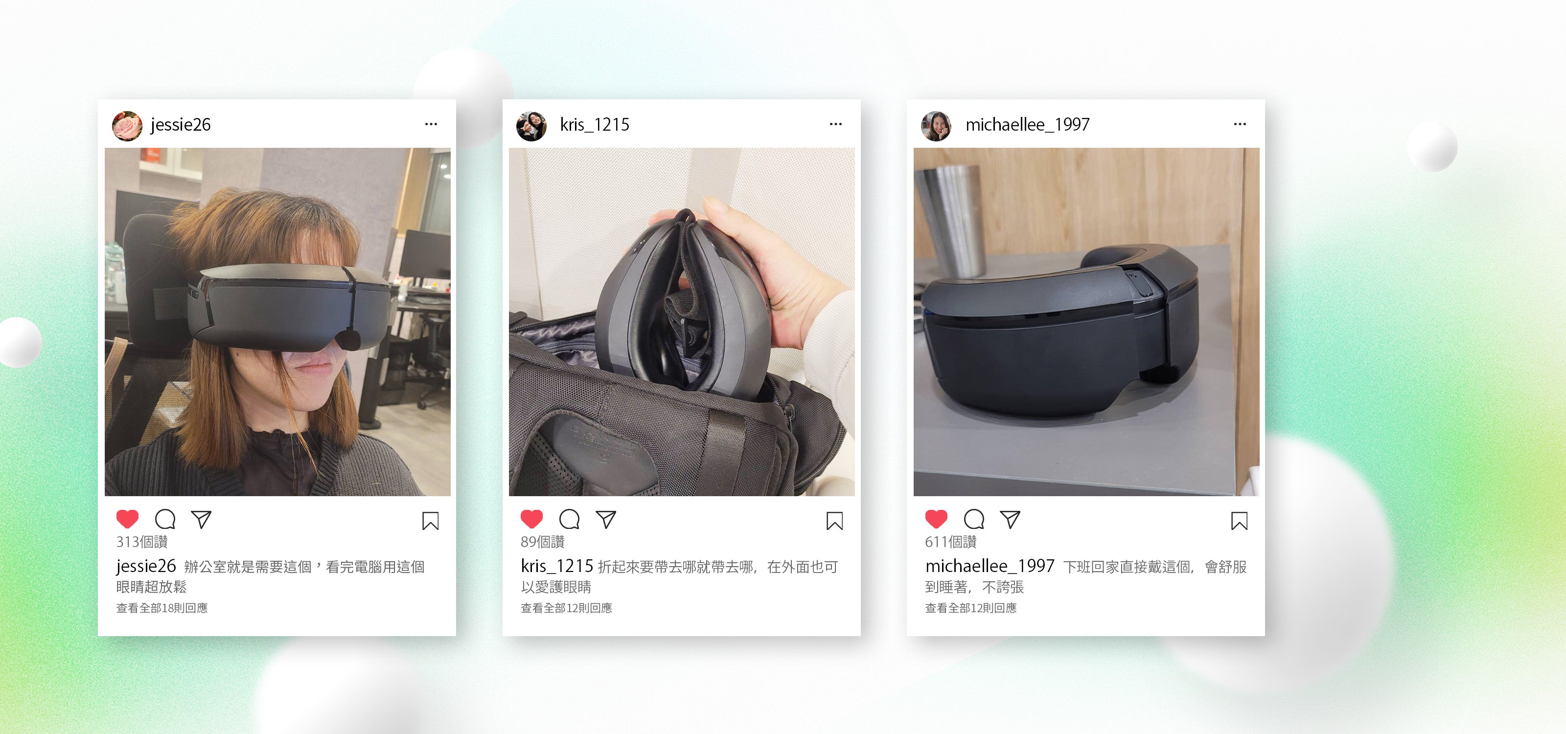 符合人體工學,4個眼部雙層氣囊+2個太陽穴氣囊全面包覆,3種模式擬真人指腹按摩手感,好比專業按摩師按摩般舒適