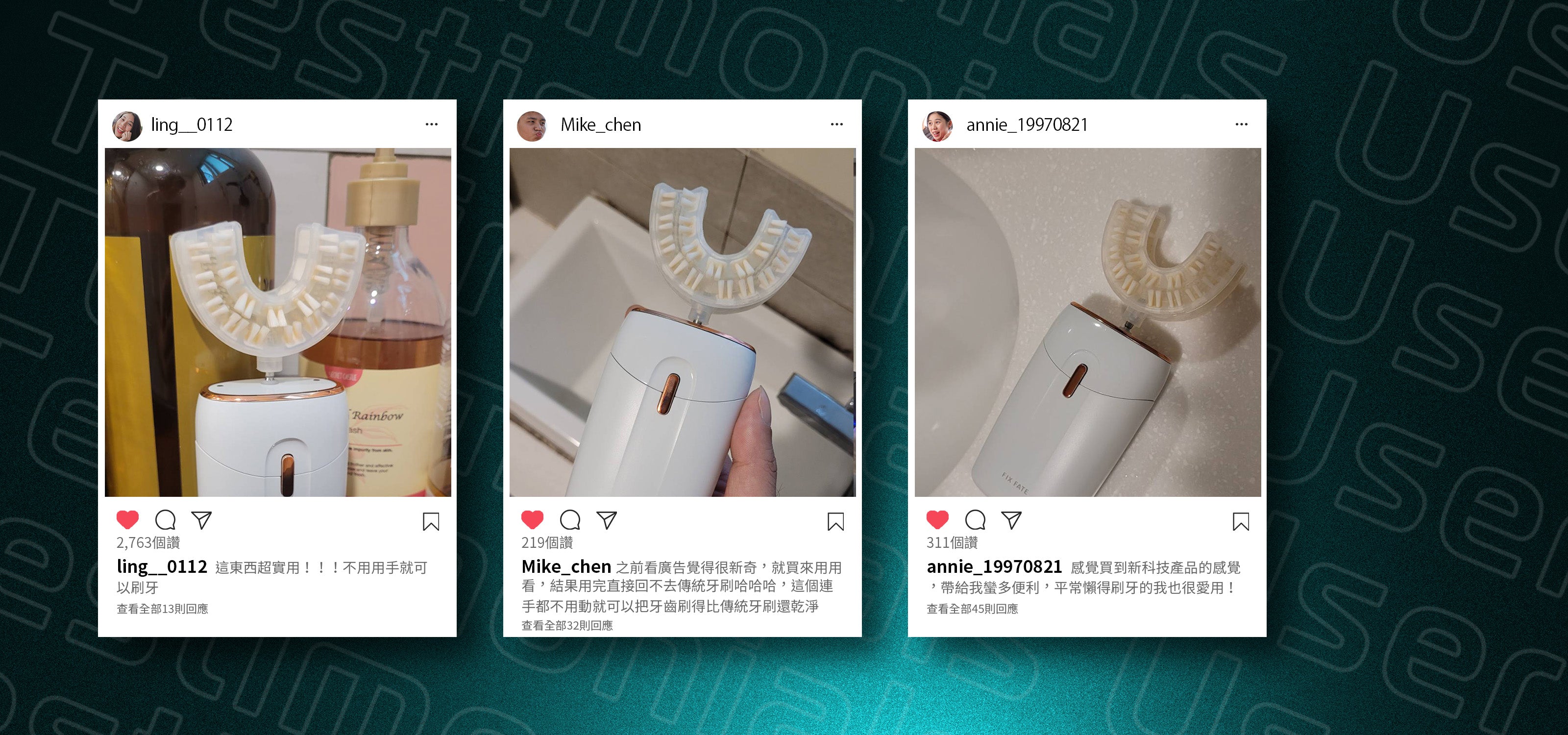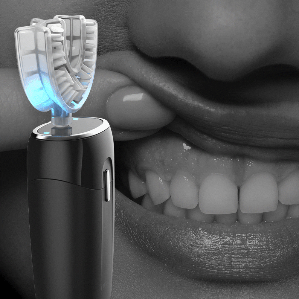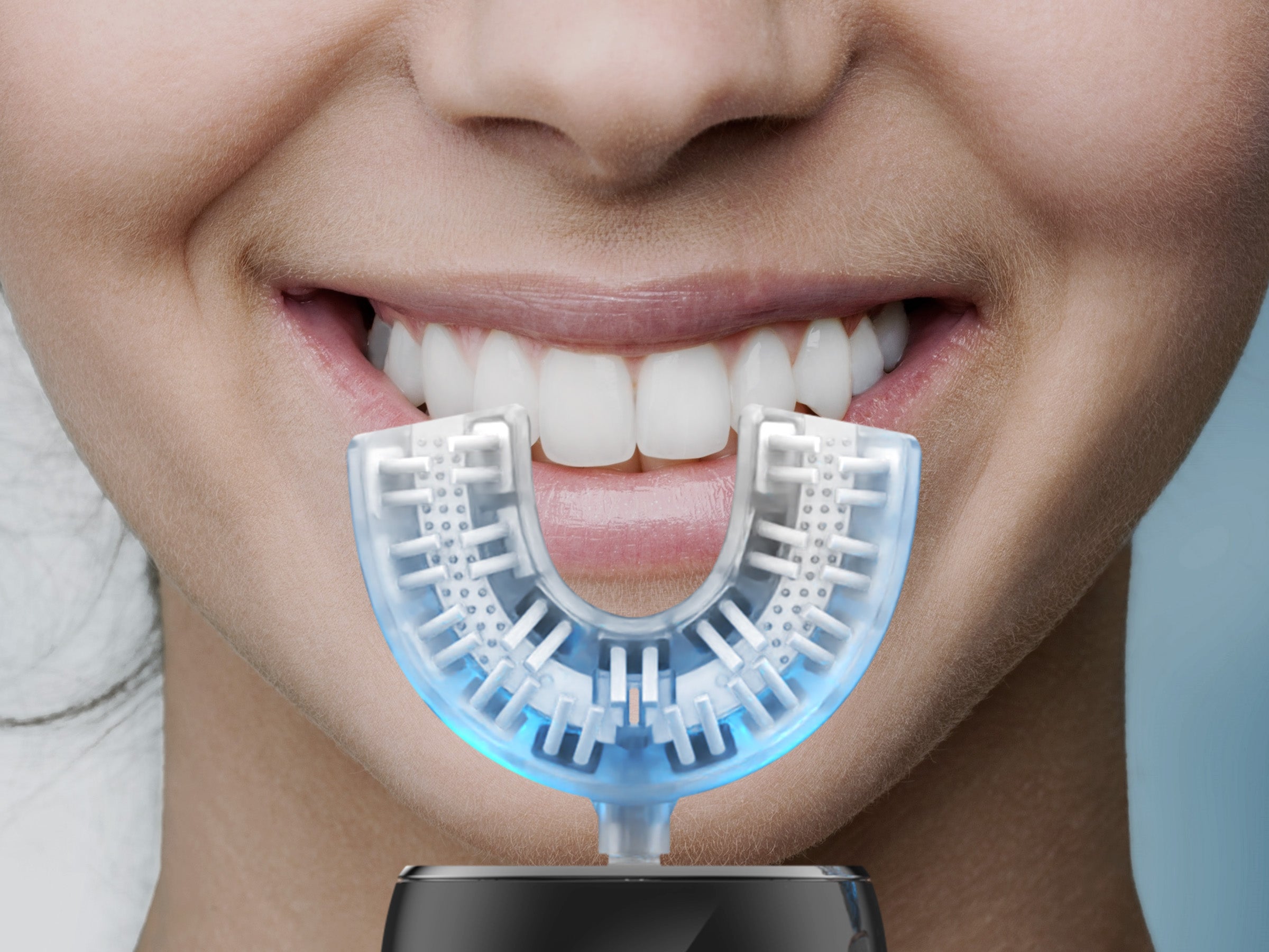半圓形環狀設計,貼合口腔,前後左右100%全面包覆,任何一個角落跟縫隙都刷得到,改善傳統牙刷刷不乾淨的缺點。