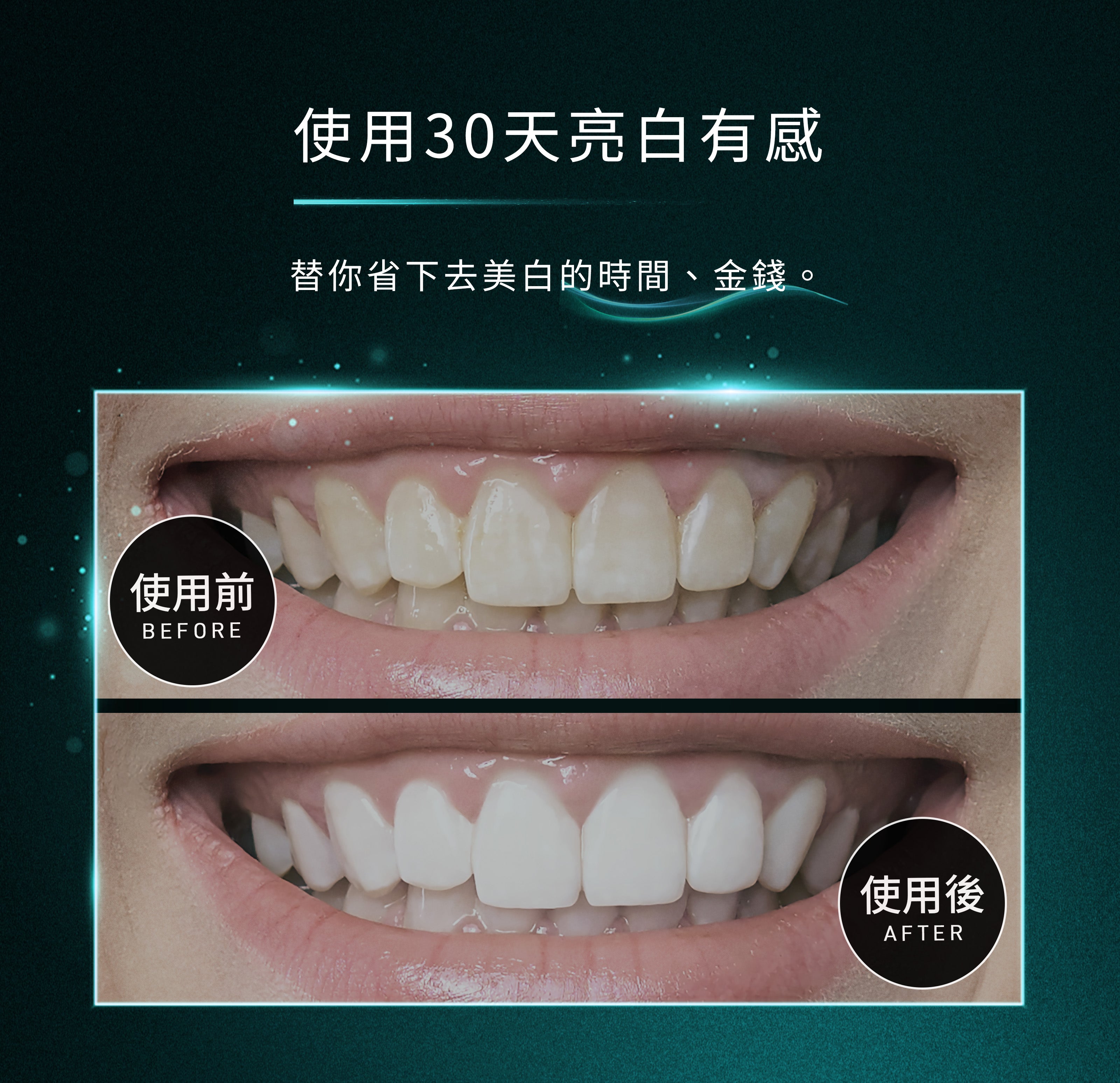 比市售UV美白光更無副作用,溫和高強度藍光與牙膏中和美白成分做用,去除色素沉澱產生亮白效果。