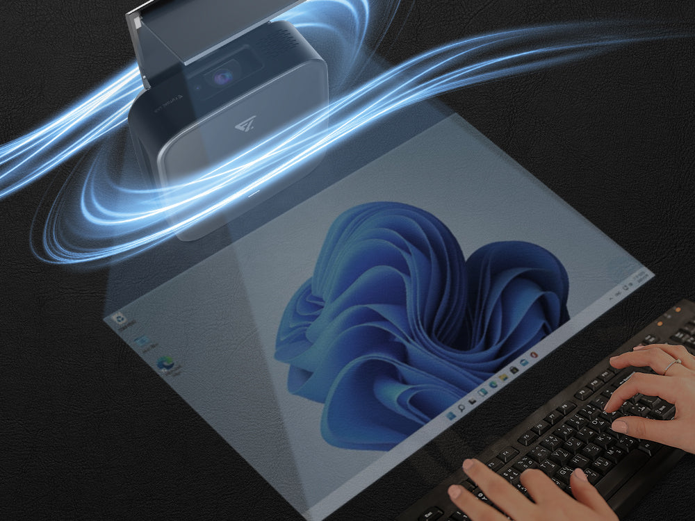 獨家鏡面折射投影技術,透過機身底部的伸縮反射鏡,將直立投影影像,直接打在桌面形成螢幕,打出來的影像也能自動轉換,不會有左右相反的問題,改變現有電腦、投影機的使用方式,直接在桌面辦公。