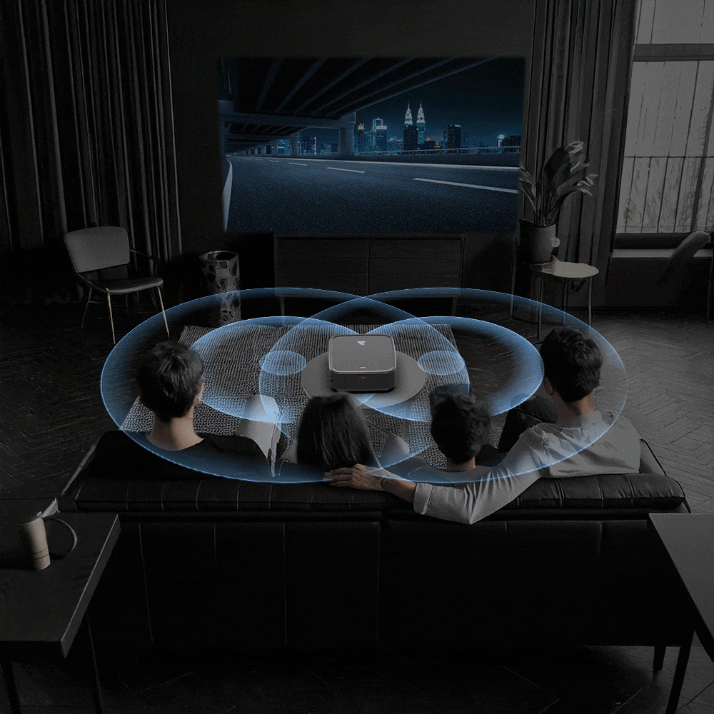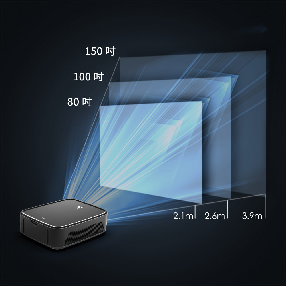 採 1.2:1 投射比,不再被傳統螢幕限制,可自由變換銀幕大小,畫面可以從80-150吋,任你挑選,輕鬆獲得專屬於自己喜好的感官體驗。