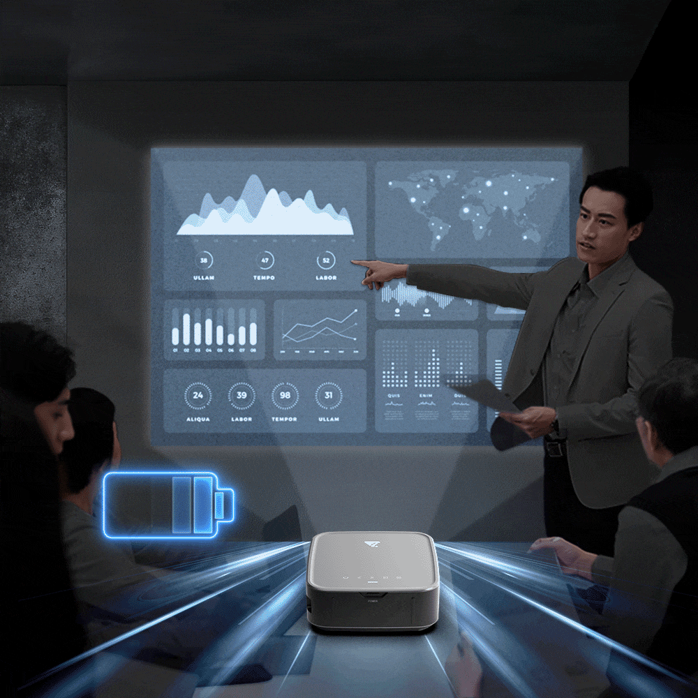 內建充電電池,改善傳統投影機必須在定點插電使用的問題,在外面使用不用再擔心找不到插座,充飽電之後,開完一場會議都不是問題。