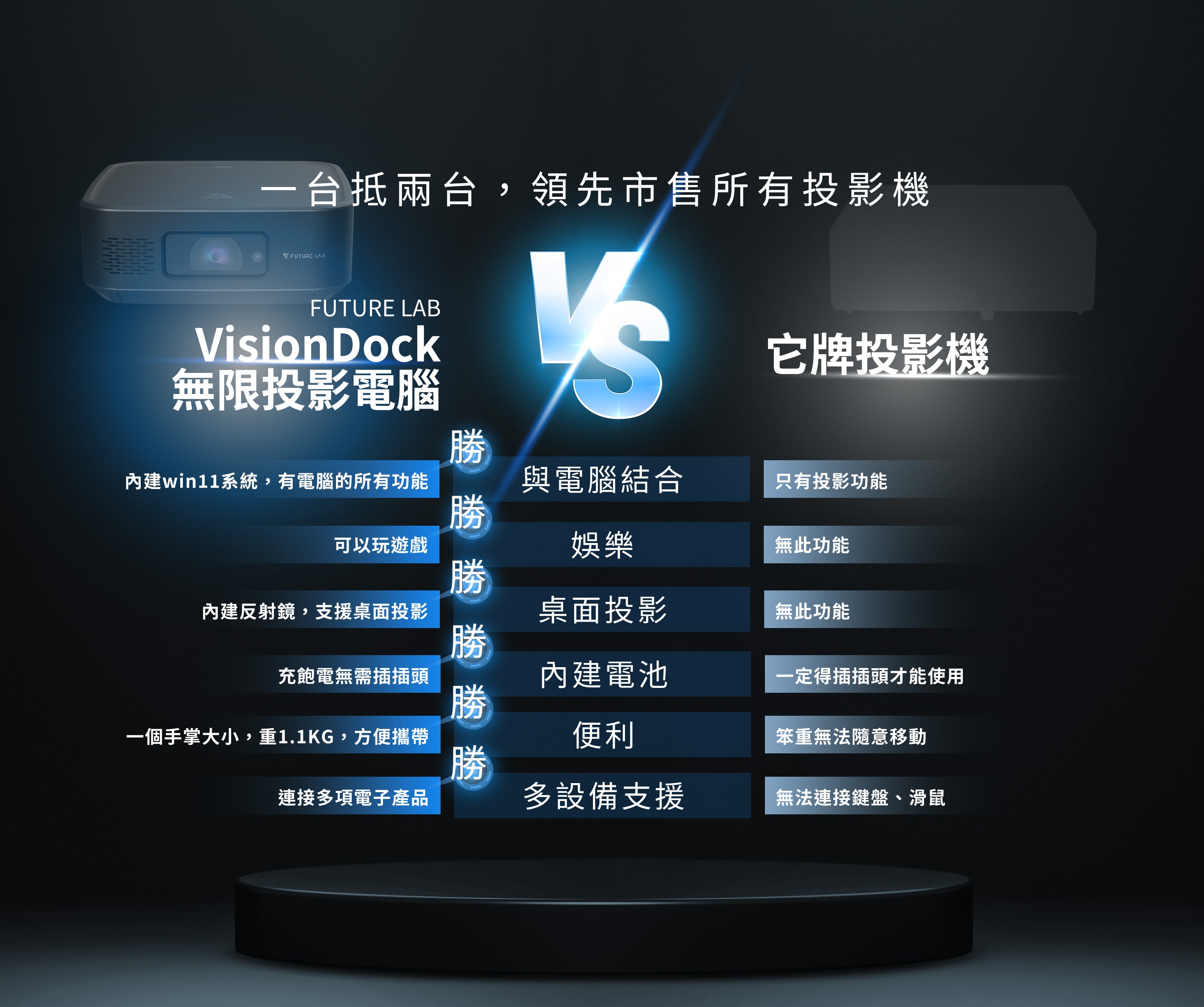 針對大眾對於工作與娛樂的需求,我們推出了這款結合電腦與投影機的無限投影電腦,為世界首創,徹底顛覆所有人對於投影機的想像,在未來,我們的視野不用再被小螢幕所框架,有了這台隨身攜帶的投影電腦,到哪都有大銀幕可以享受。